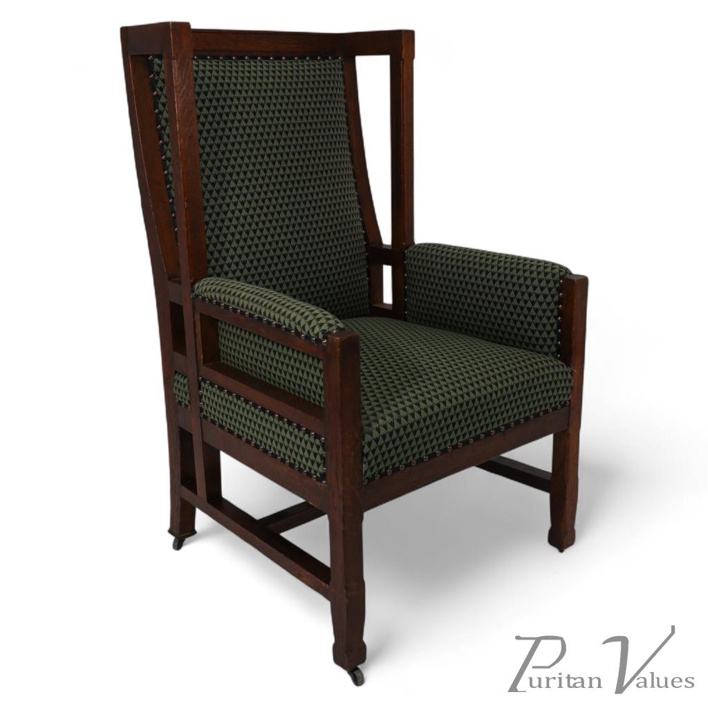 Liberty and Co, attributed, in the style of Leonard Wyburd. An Arts and Crafts oak wing back armchair with unusual upper open sides. The back supports curve down through to the back legs. The forward part of the wings follow down through the arms and seat to meet the lower side stretchers which are united by an under seat stretcher, giving the armchair a subtle Anglo-Japanese style about it. A great design, sturdy and very well made with chamfered edges throughout which stop and start before where the joints meet and feet end. Professionally re-upholstered in a quality green chequered fabric.