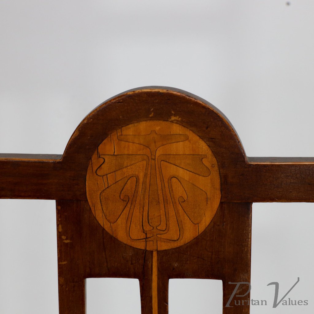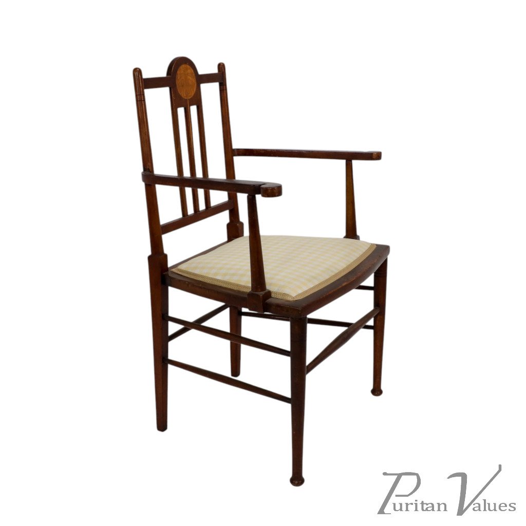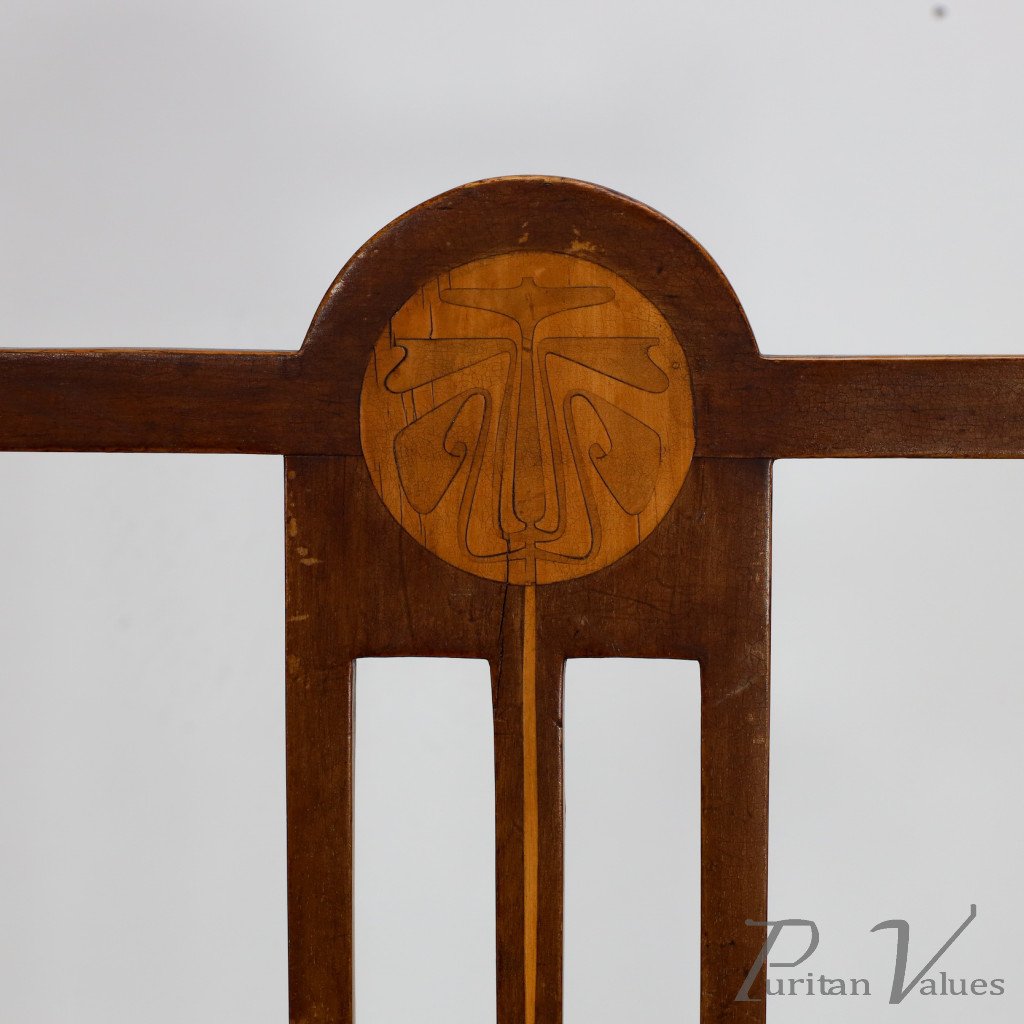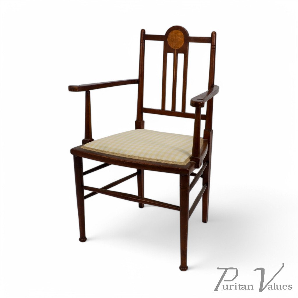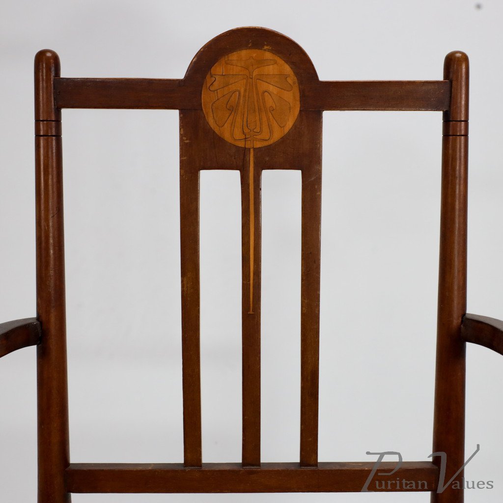 George Montague Ellwood’s work for Liberty & Co favoured slim members, circular motifs set as calm focal points, and restrained inlay that guides the eye while keeping the structure clear. This chair follows that language closely, the roundel, stick back, scroll arms and disciplined geometry aligning with Liberty’s programme around 1900.