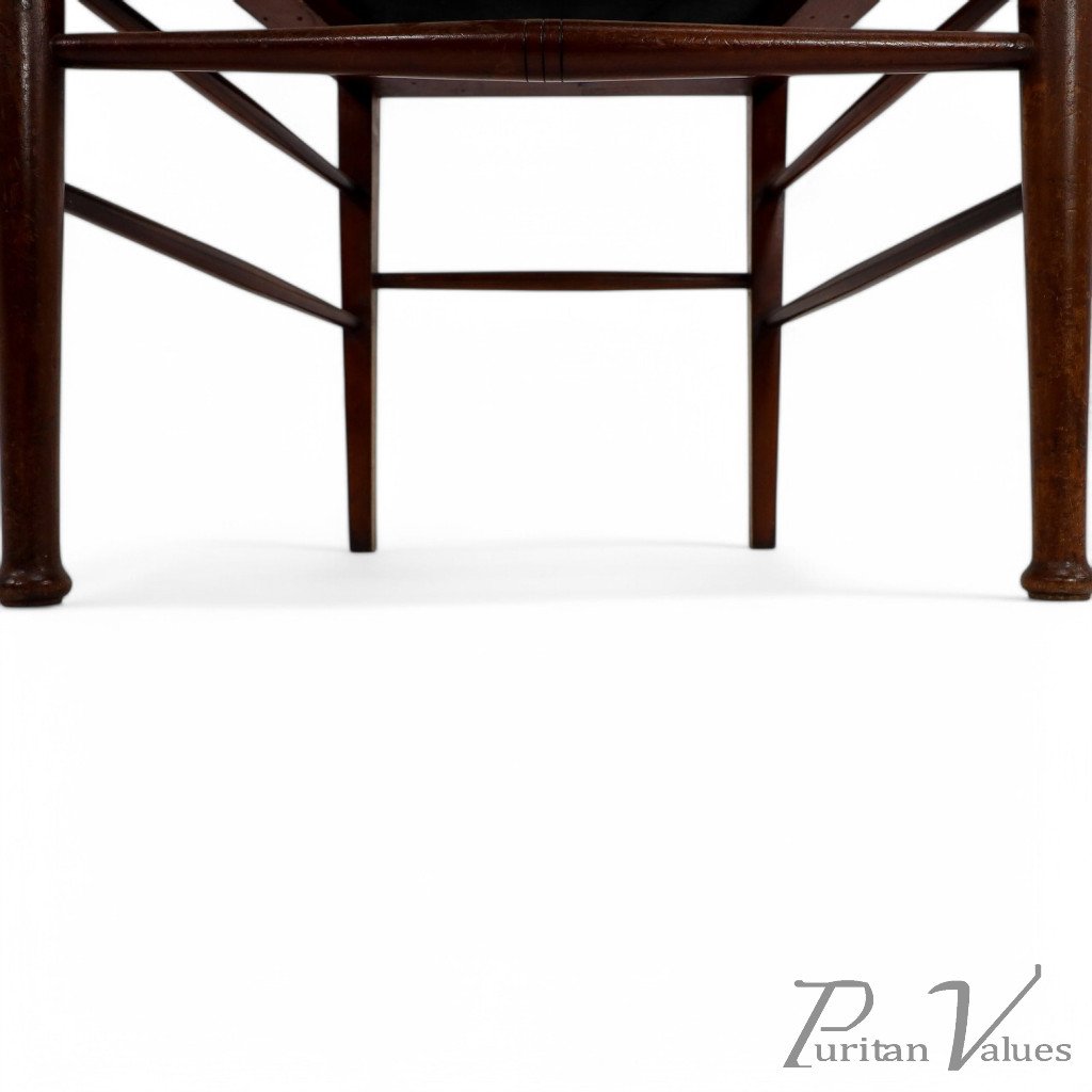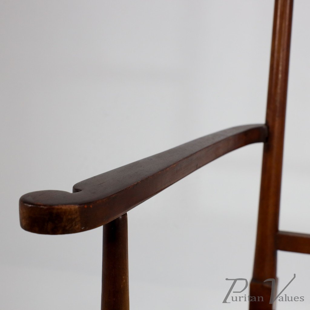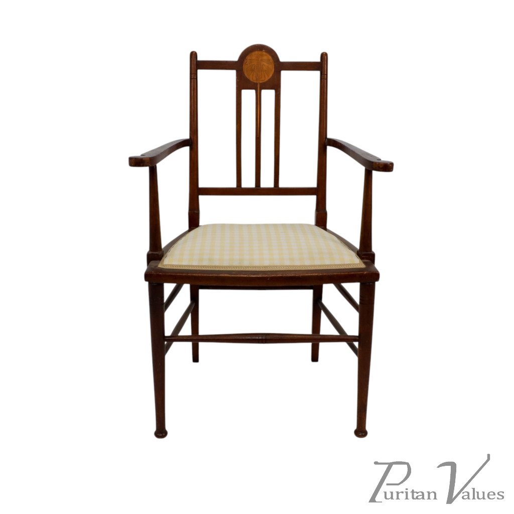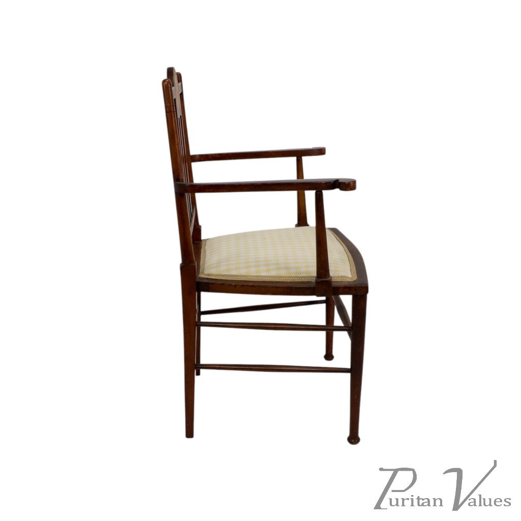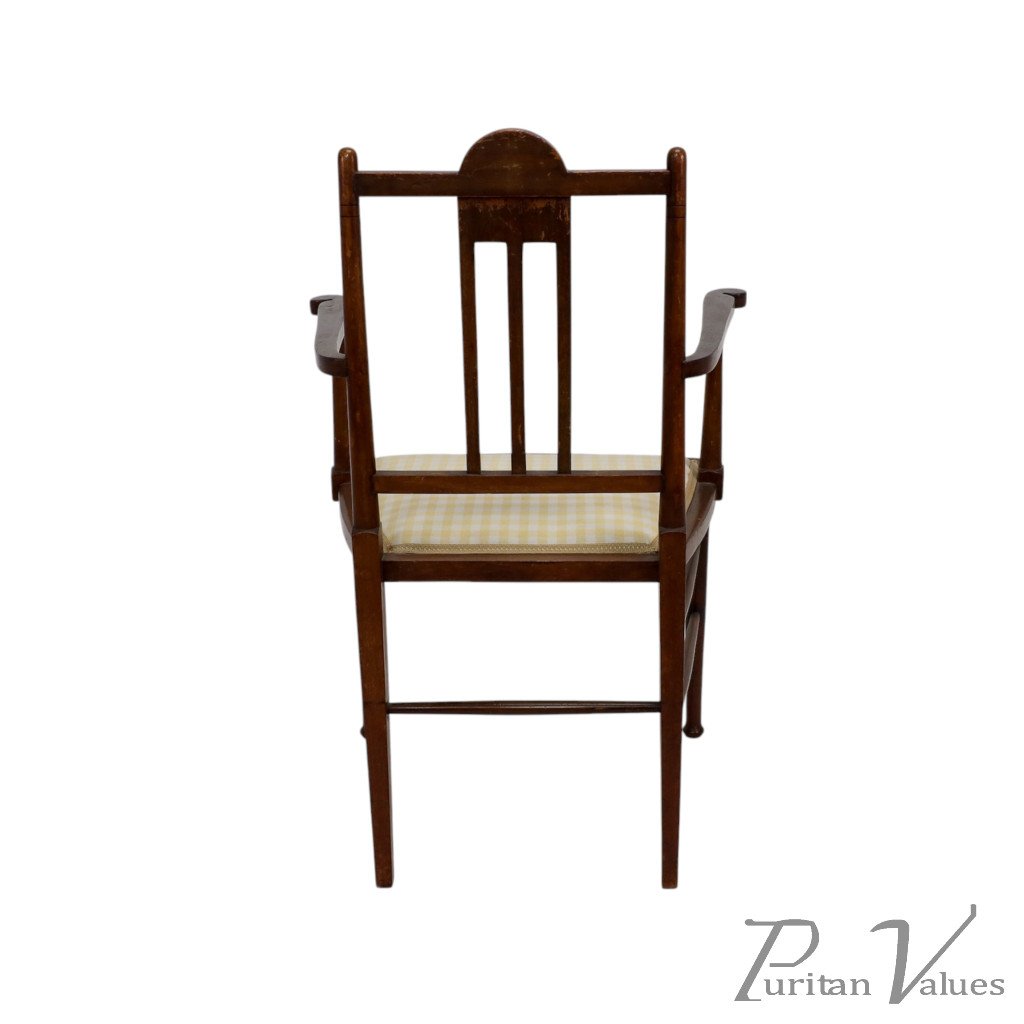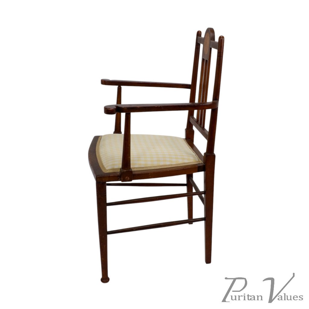 George Montague Ellwood’s work for Liberty & Co favoured slim members, circular motifs set as calm focal points, and restrained inlay that guides the eye while keeping the structure clear. This chair follows that language closely, the roundel, stick back, scroll arms and disciplined geometry aligning with Liberty’s programme around 1900.