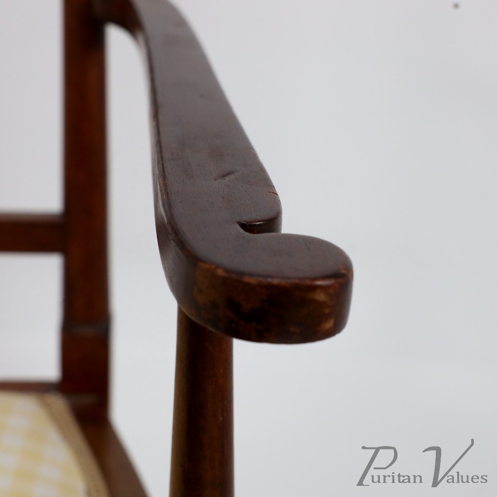 This armchair in walnut sits within the Arts and Crafts (1880–1910) tradition, c.1900, British, by Liberty & Co in the Ellwood idiom. The back centres on a circular roundel with stylised line inlay, above a narrow stick splat with a single inlaid drop. Slim uprights rise just proud of the top rail. Scroll-ended arms return to simple posts, the drop-in seat upholstered, the frame carried on round legs joined by H-stretchers for poise and strength.