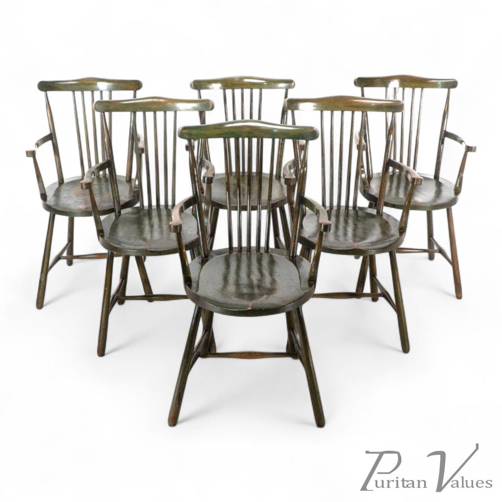 Six Liberty & Co., walnut Arts and Crafts Windsor armchair with original green finish.
