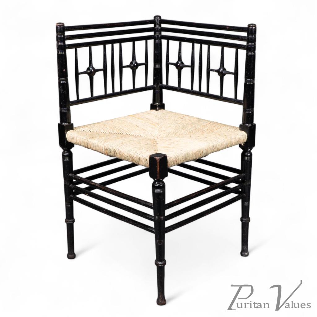 Liberty and Co. An Aesthetic Movement ebonized corner armchair from the Argyll suite designed in 1884. The design is after a Sussex corner chair designed by Ford Madox Brown for Morris and Co. We have recently had it professionally re-rushed.