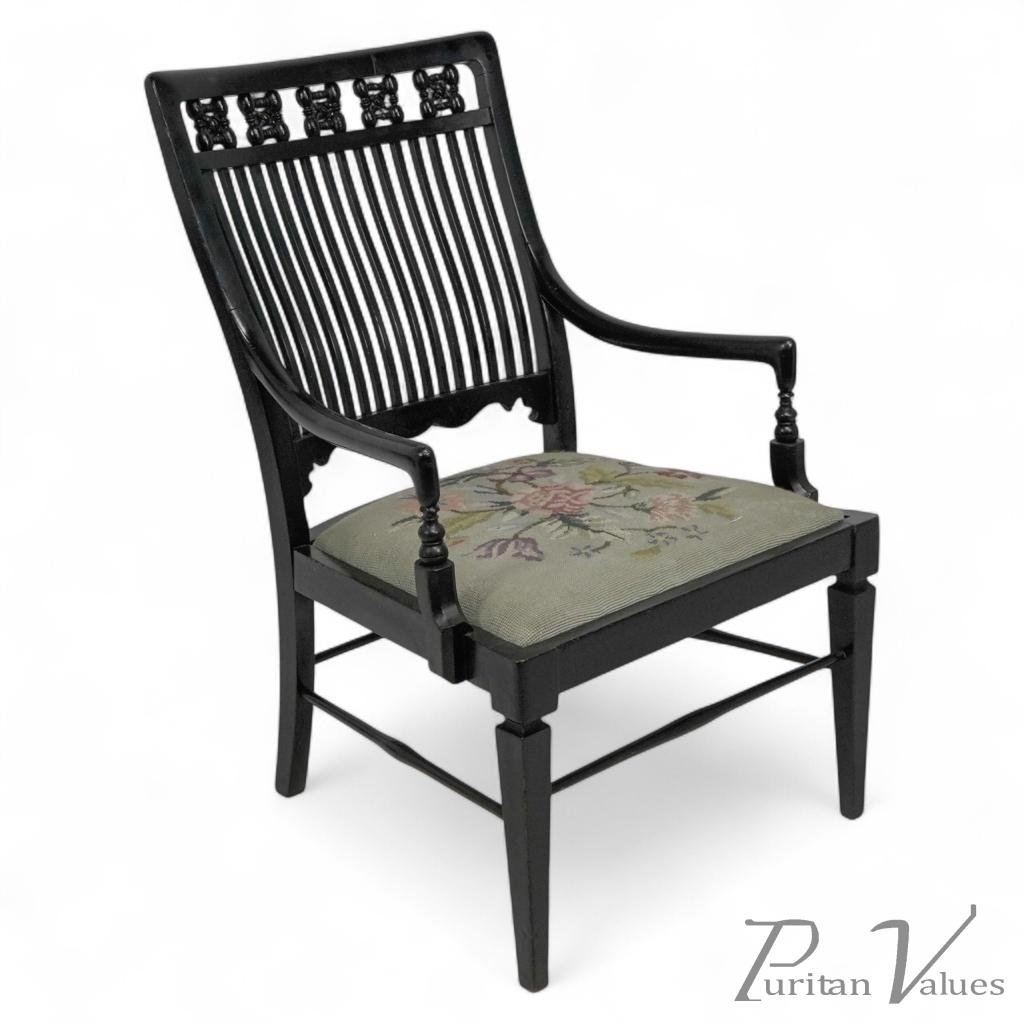 An Aesthetic Movement ebonized Moorish low armchair with a shaped back with mashrabiya turnings to the head rest and tapestry seat.