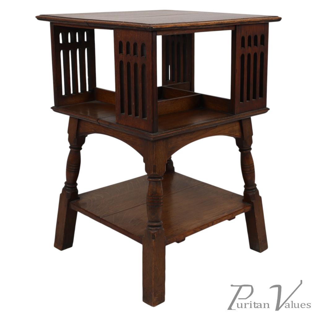 Liberty & Co. A rare Arts & Crafts oak revolving bookcase table on square turned legs, united by a lower shelf.