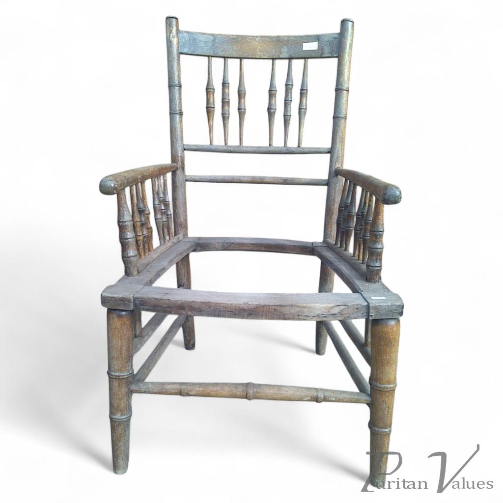 An early Liberty & Co. armchair that sits squarely within the Aesthetic Movement as it turns toward the 1890s. The architecture is spare and rhythmic. A shallow cresting rail tops a field of fine spindles, the uprights worked as simulated bamboo that nods to the period’s Japoniste taste. The flared arms settle on ranks of short turned balusters, a disciplined colonnade that lightens the profile.