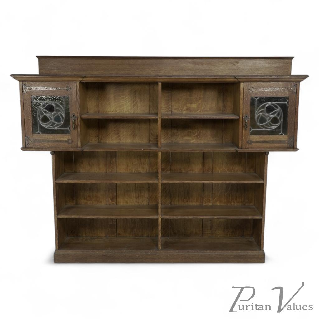 Liberty & Co. Arts & Crafts Oak Bookcase Stain Glass and Copper Hinges & Handles