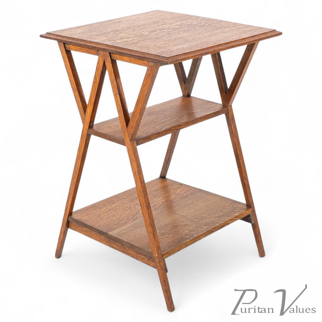 Side table in oak, attributed to Liberty and Co, from the Arts and Crafts Movement (1880–1920), c.1910. The design has three rectangular tiers supported by angled uprights that form open triangular frames on each side. The structure is light yet stable, with precise joinery and a balanced geometric composition. Its simplicity of line and measured proportion reflect Liberty and Co’s late workshop designs.