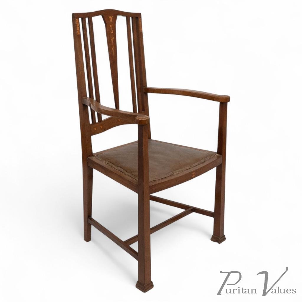 By Liberty & Co., attributed, an armchair in walnut aligned to the Arts and Crafts movement (1880–1910), c.1905. The rectilinear frame carries a gently arched crest, a tapered central splat and narrow uprights. Petite heart and floral inlays accent the crest, splat and lower back rail. Shaped arms, a trapezoidal seat with leather pad and a square stretchered base give a light, purposeful profile suited to a dining or occasional setting.