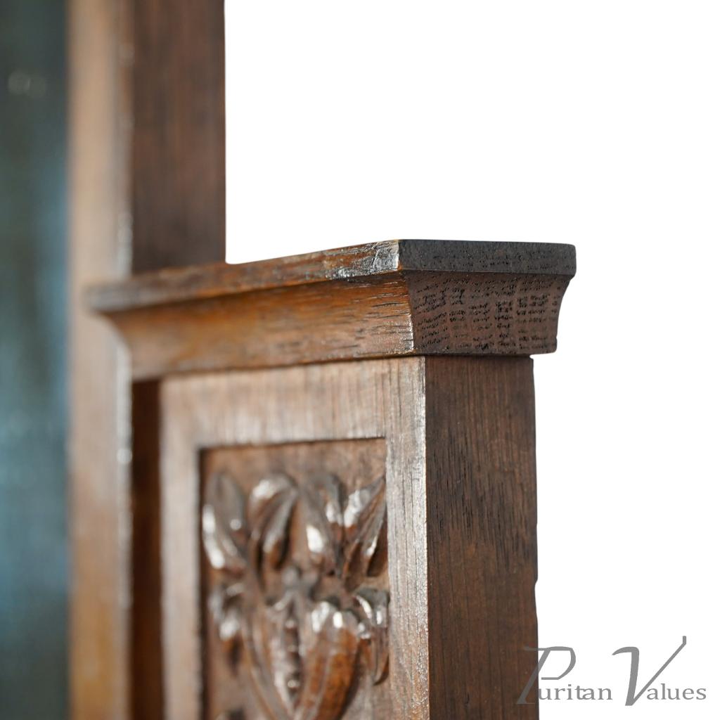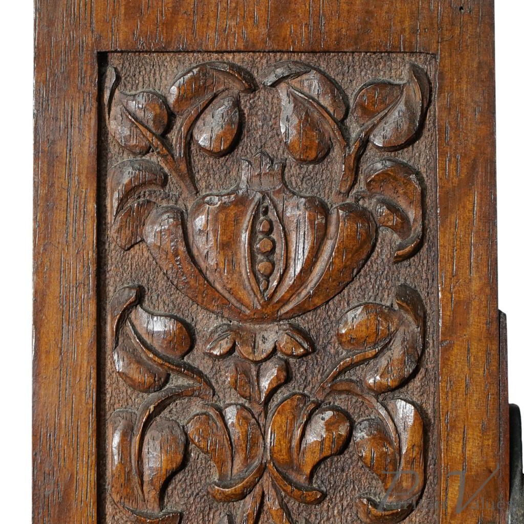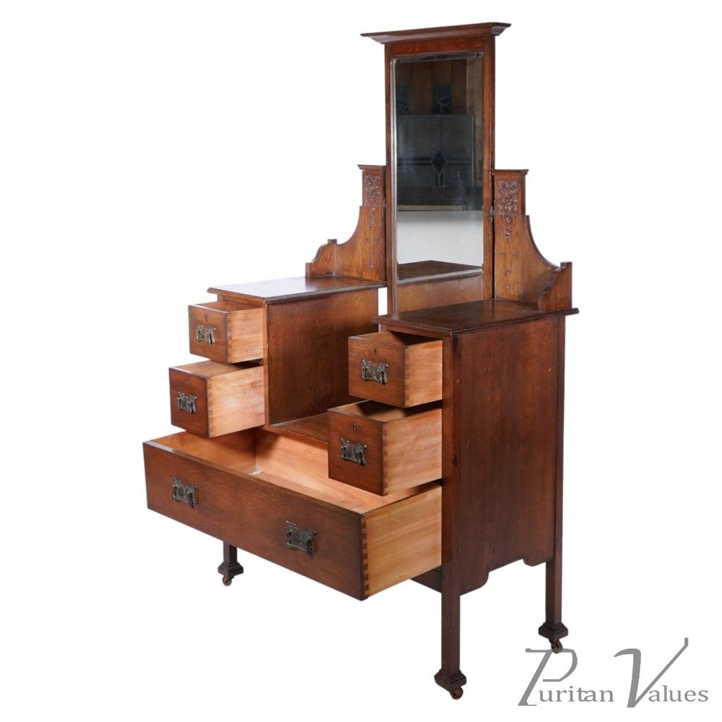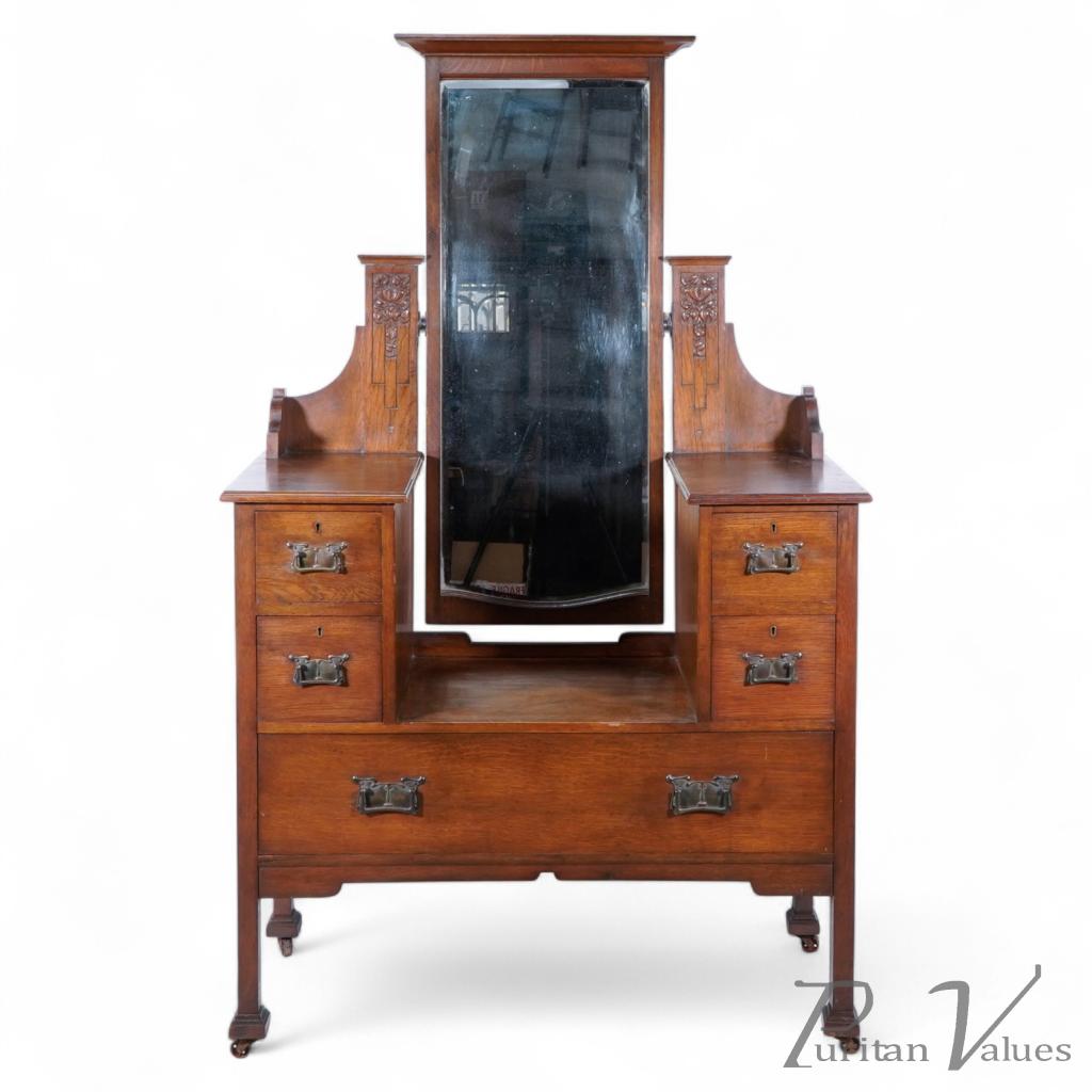 Liberty & Co attributed. An Arts and Crafts oak dressing table with a central three-quarter length bevelled swivel mirror flanked by carved floral decoration to the mirror supports. Four small drawers with a central open area and a full-width drawer to the base. Stood on square legs with square feet on original castors.
