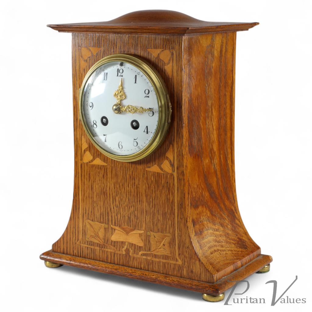 Liberty & Co., An Arts & Crafts Oak Mantle Clock with Floral Inlay