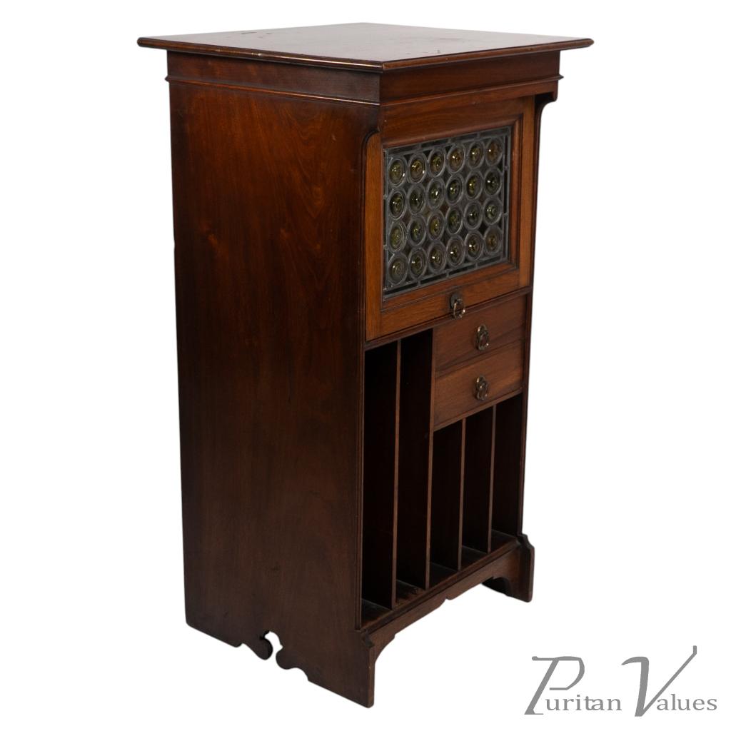 Liberty & Co Moorish walnut music cabinet with bottle neck glass up & over door