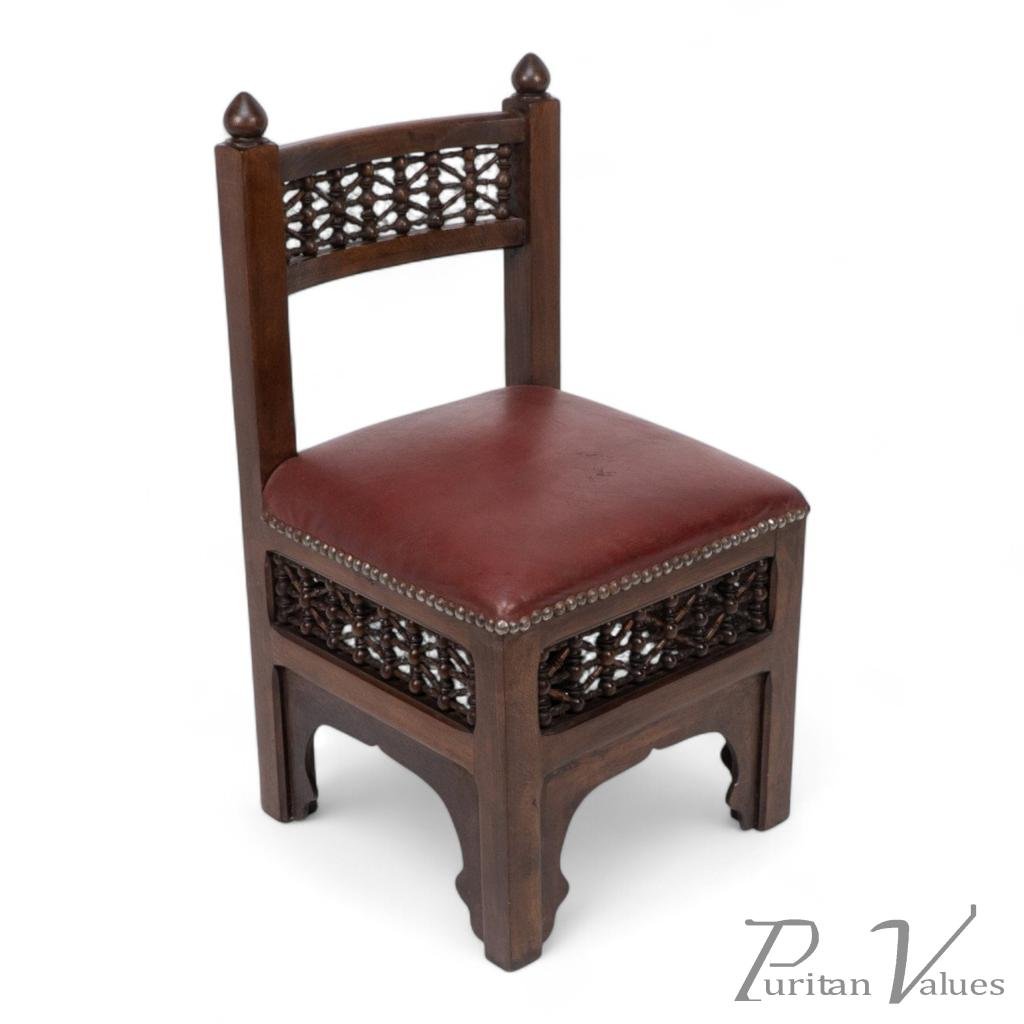 Moorish side or child's chairs with Mashrabiya turned details to the backrest and on all four sides below the seats, one with a black studded leather seat, with a red studded leather seat, and Moorish arched aprons below the seat.