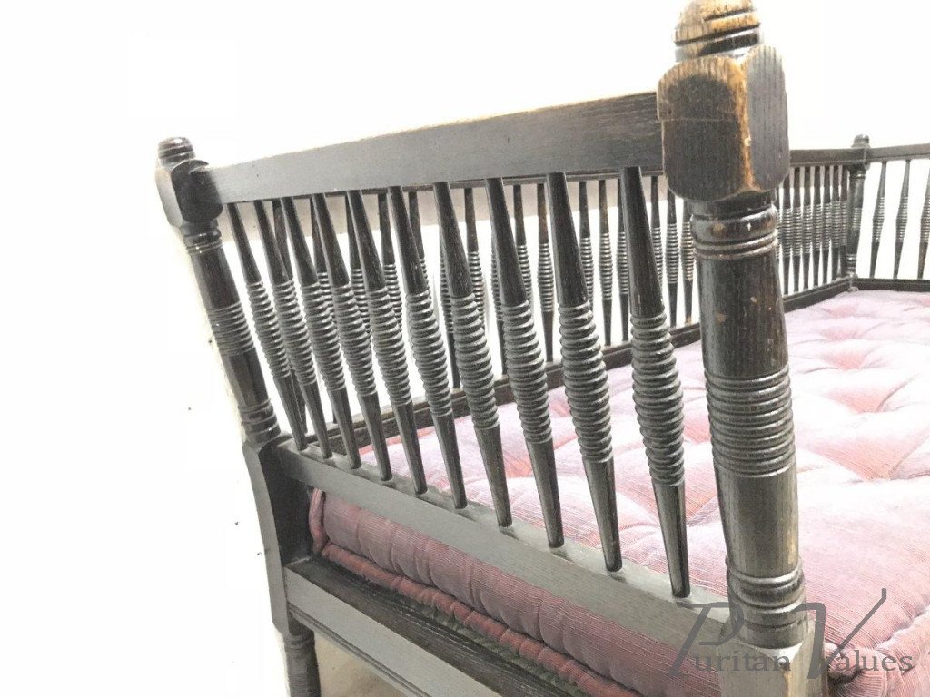 Liberty & Co, made by William Birch. An Arts & Crafts dark oak settee or sofa with turned finials, angular sides and turned uprights to the sides and to the back supports, square and turned legs united with twin stretchers below.