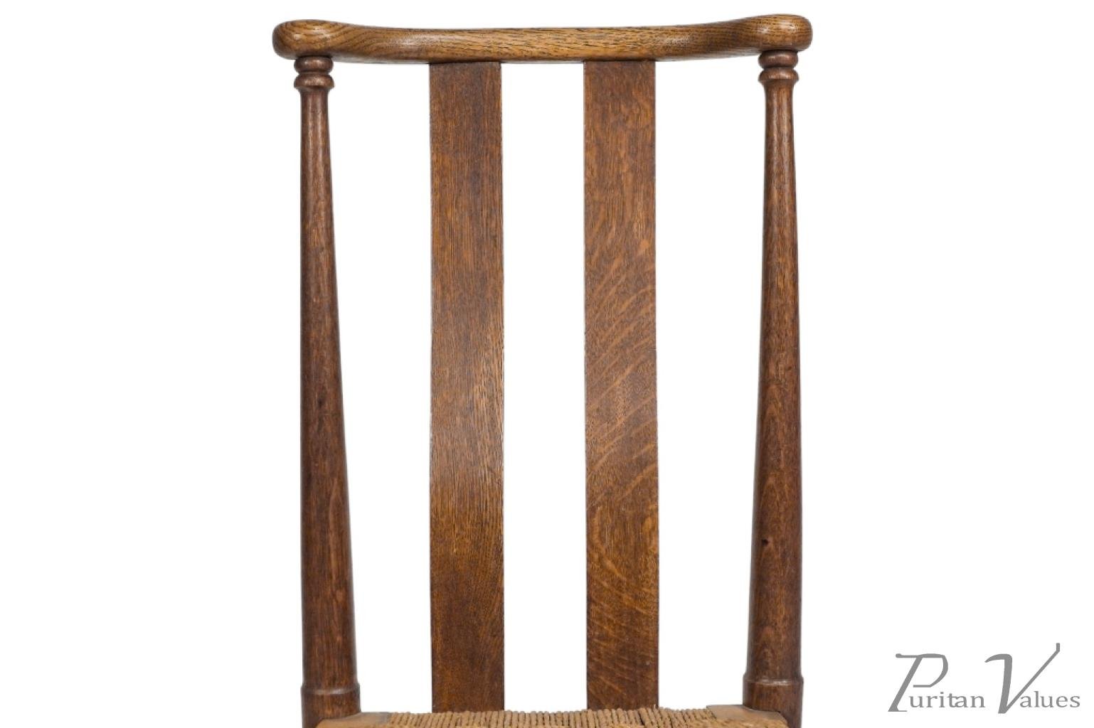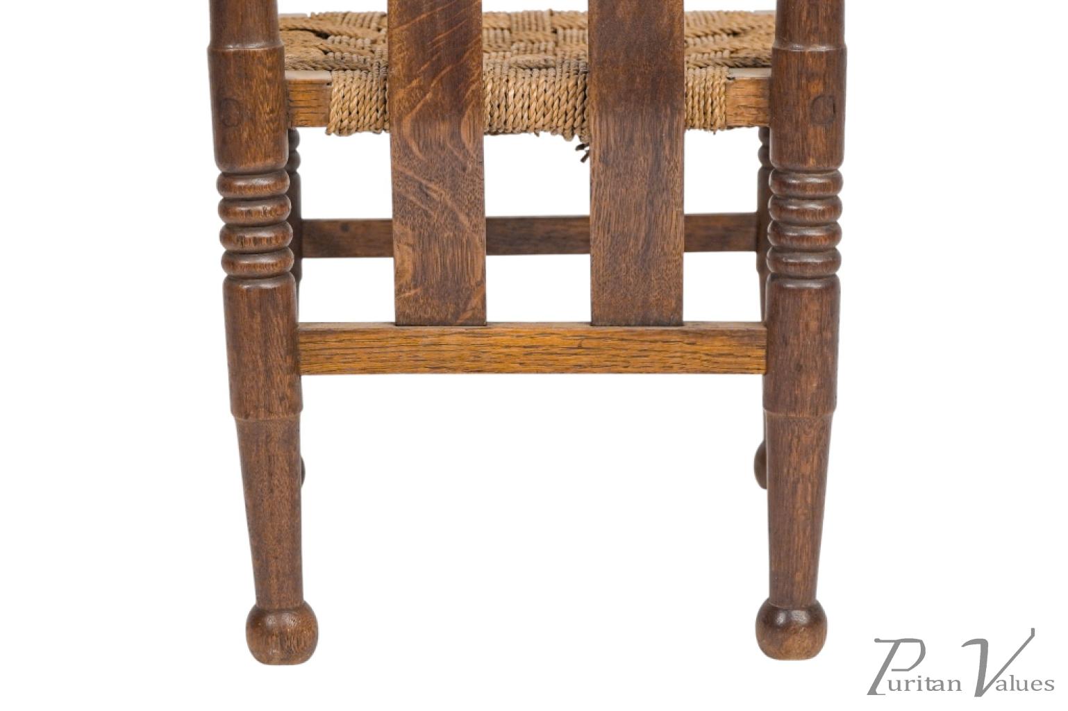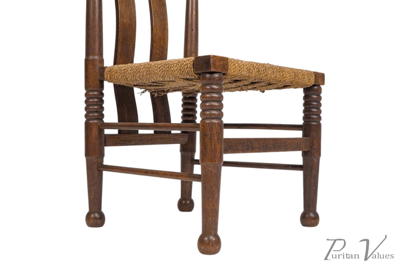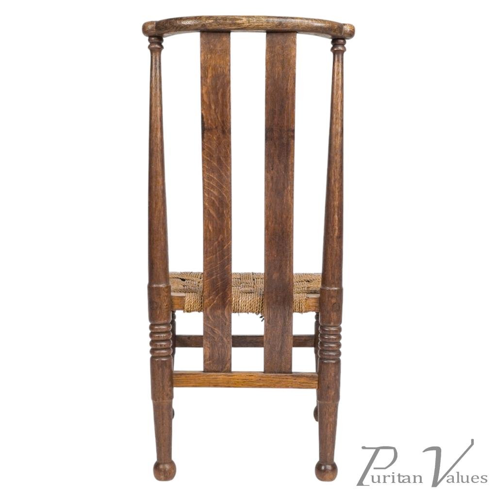 An Arts and Crafts child’s chair with the original seagrass seat, shaped head rail and shaped back rest designed for good posture, on turned front legs with ball feet.