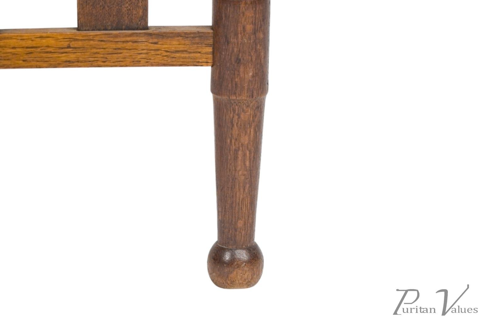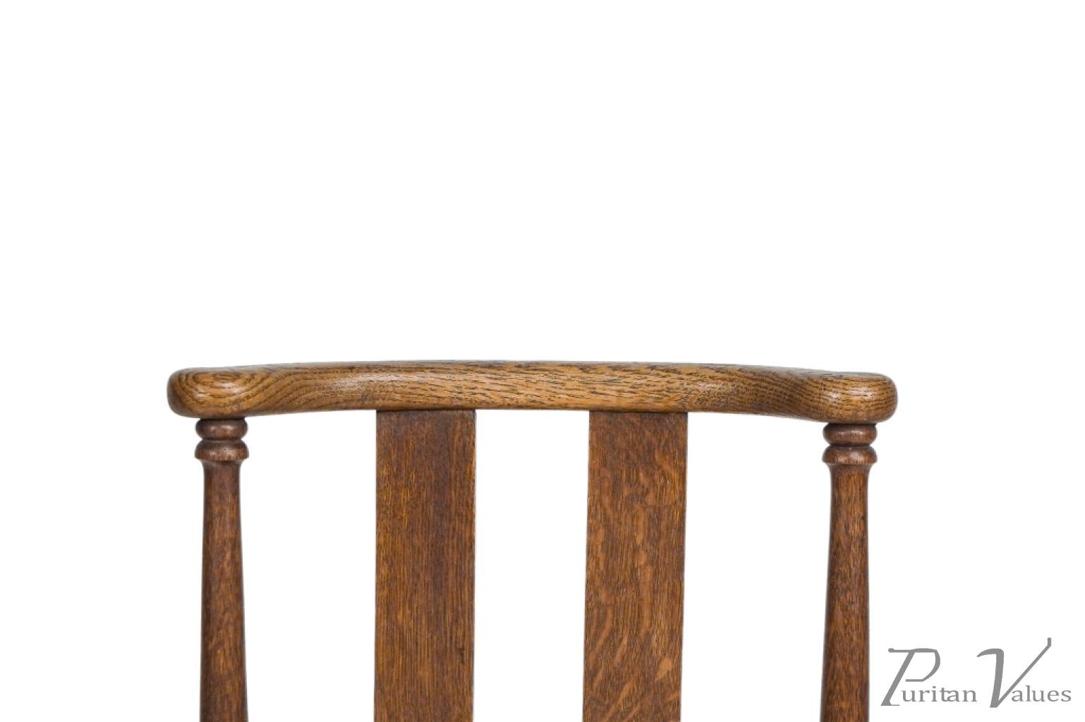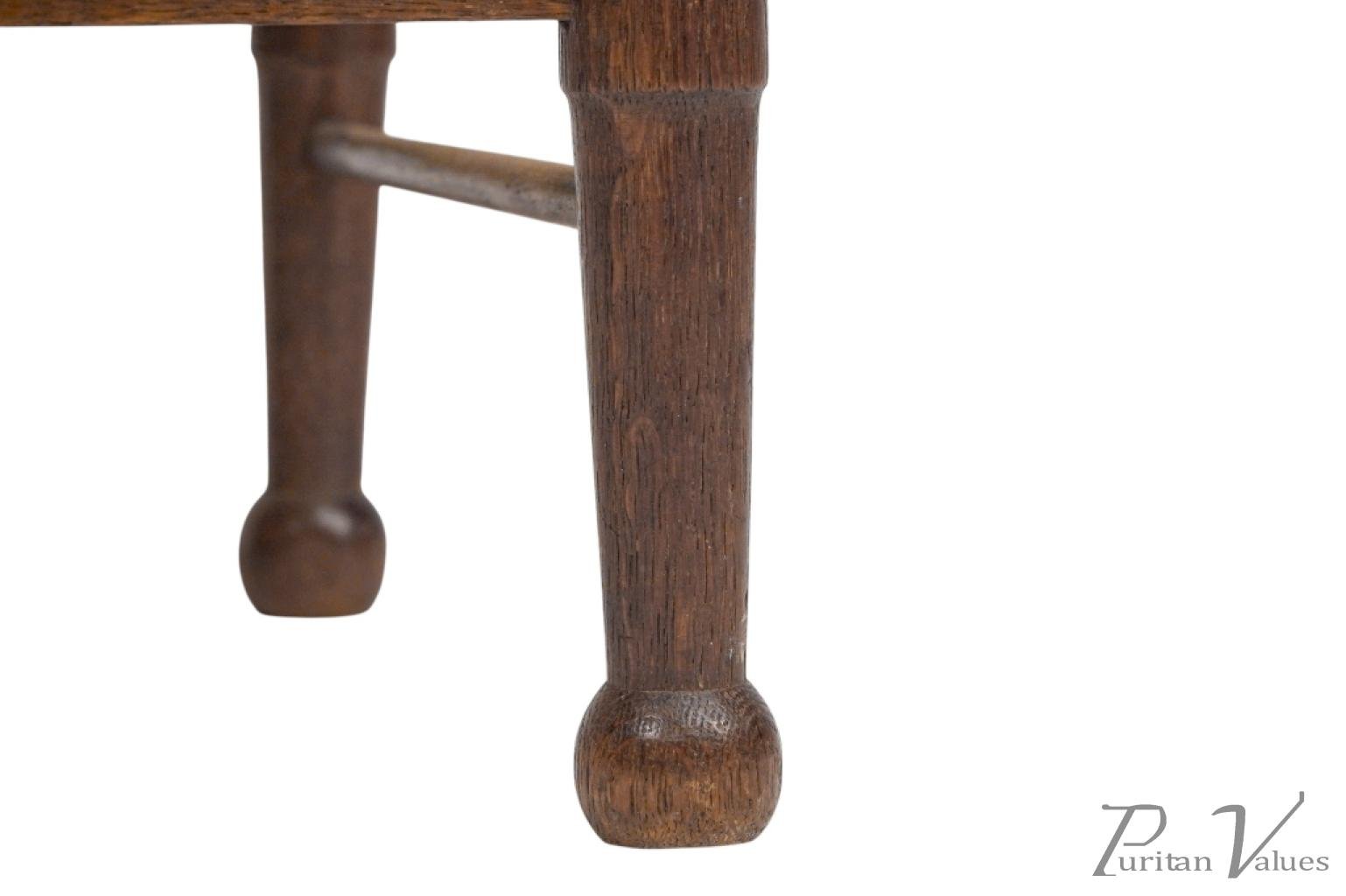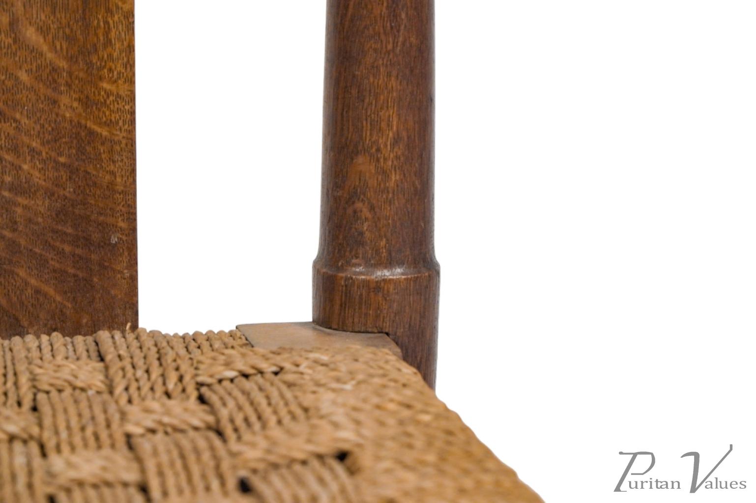 An Arts and Crafts child’s chair with the original seagrass seat, shaped head rail and shaped back rest designed for good posture, on turned front legs with ball feet.