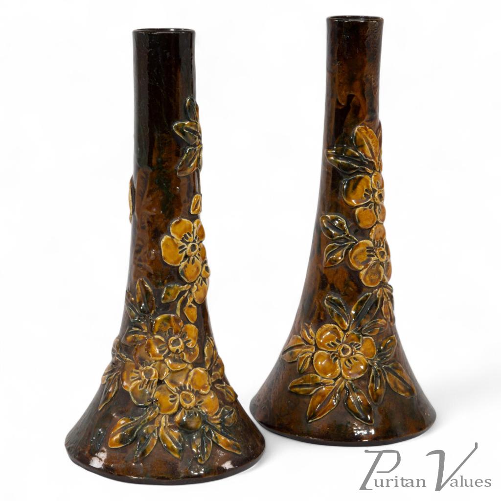 A pair of rustic ceramic vases with applied floral decoration and a typical yellow glaze to the flowers and brown glaze to the body.