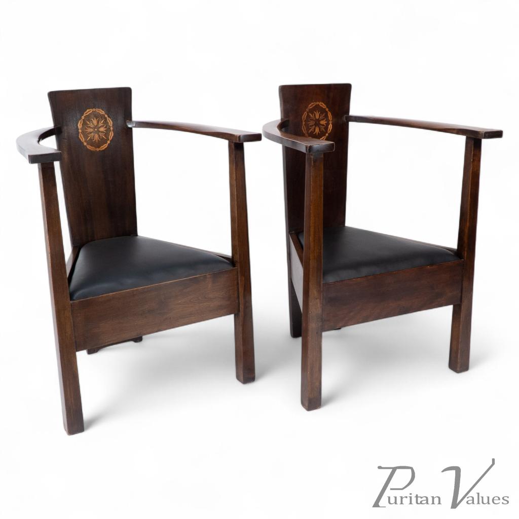 A pair of stained beech and inlaid armchairs: The tapering backs forming the main structure of these time less armchairs with foliate and ribbon-bordered roundels, flat curved and shaped arms, triform seats and square tapered front supports.