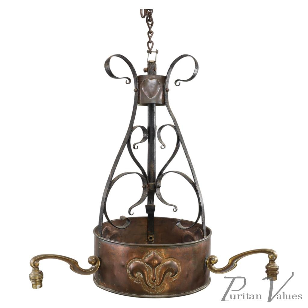 An early Arts & Crafts hand made copper and hand wrought iron three arm ceiling light with copper hearts to the top and a large central copper band embossed with stylised floral decoration.