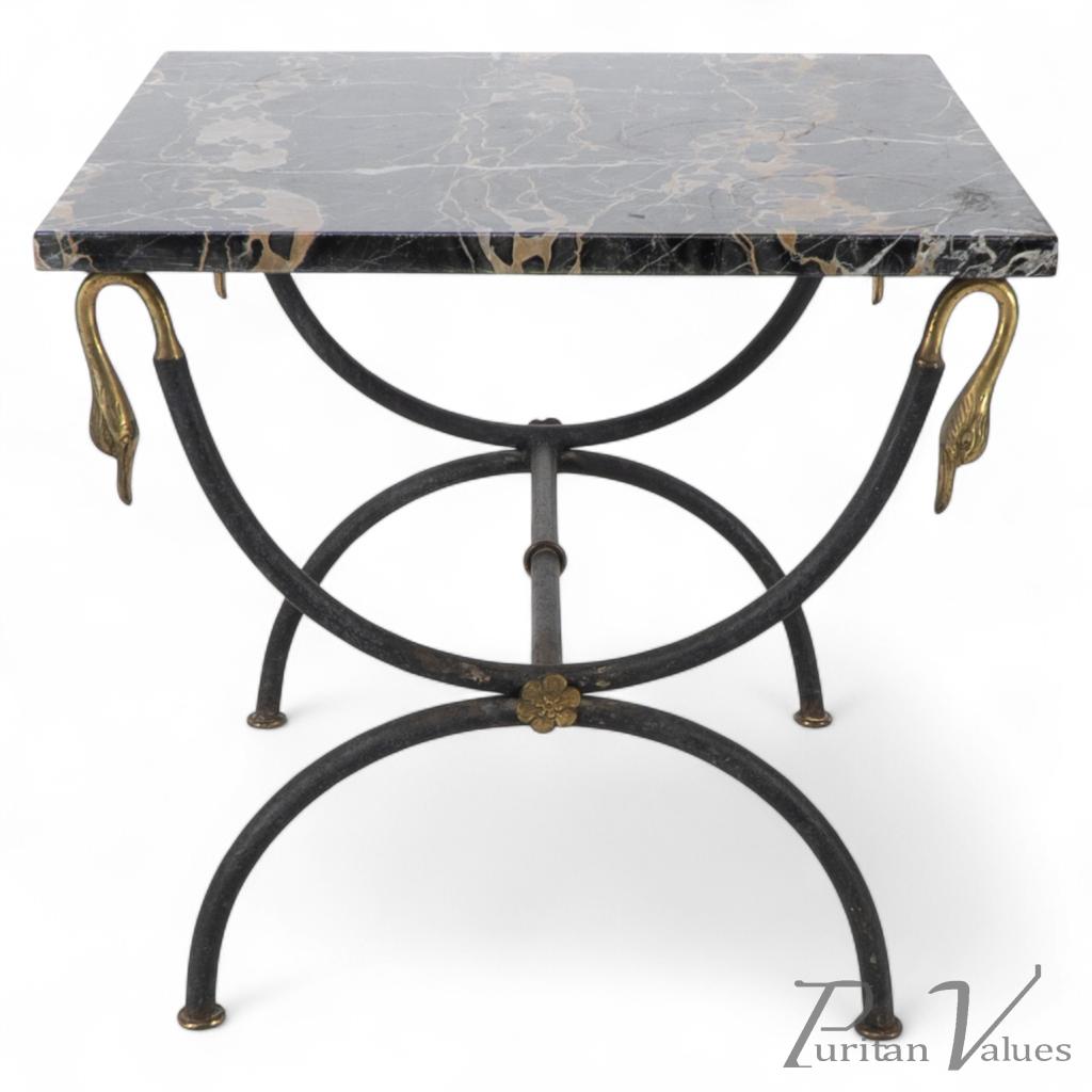 A black marble top with gold and silver veins coffee table. The marble top has location lugs that hold it firmly in place on top of the table with brass swan heads, brass florets to the side of the frame, brass rosettes to the sides center, and brass pad feet.
