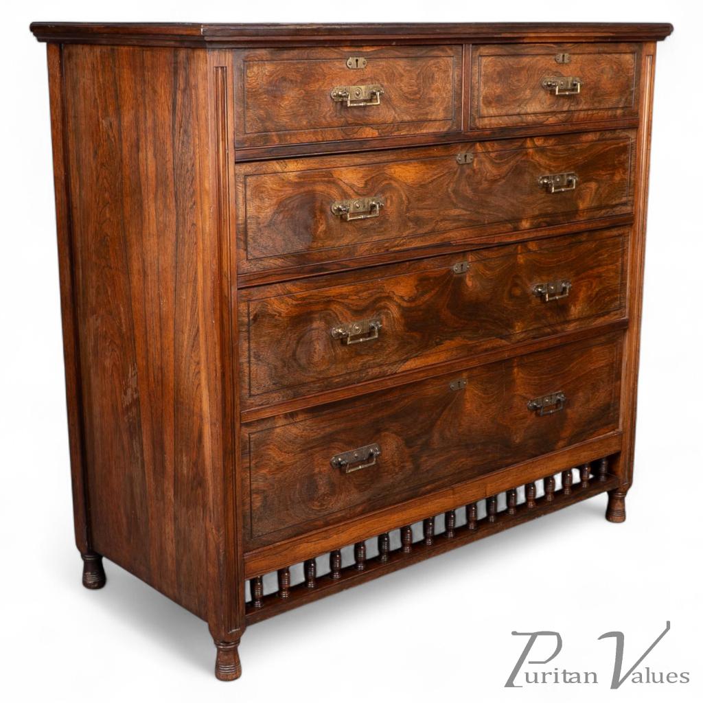 Maple & Co., London, in the style of Bruce Talbert. A good quality Aesthetic Movement chest of drawers made from walnut with a wonderful wild figuring to the grain.