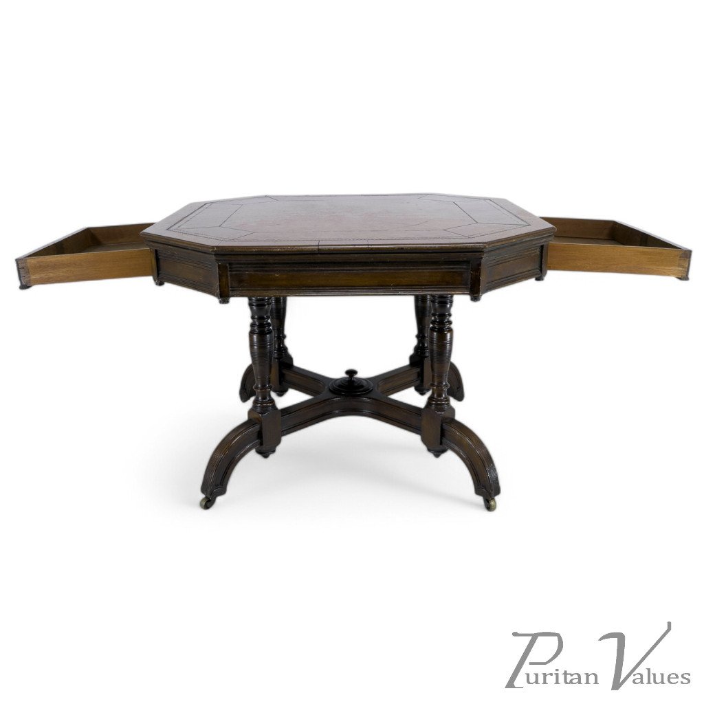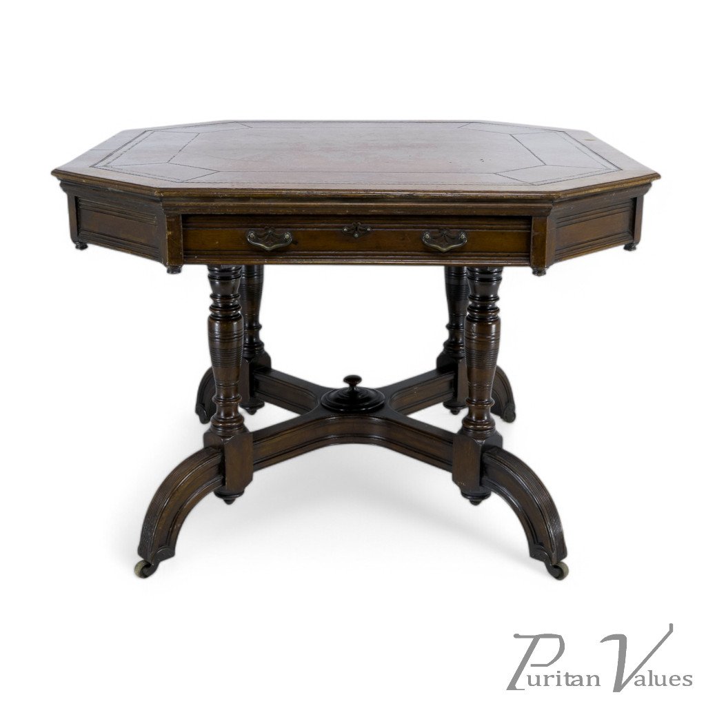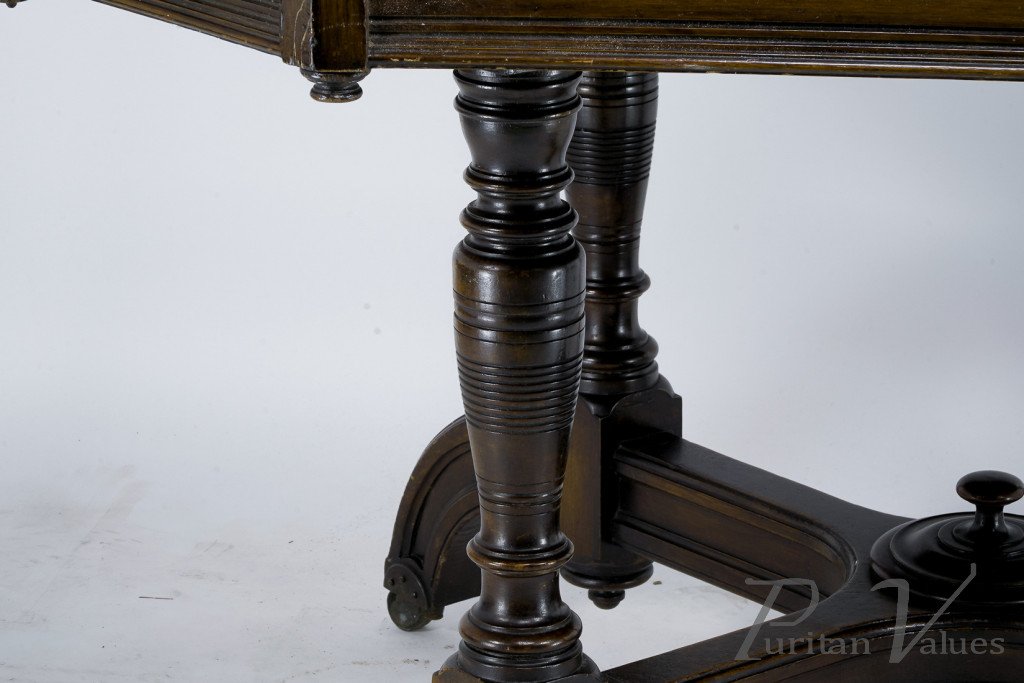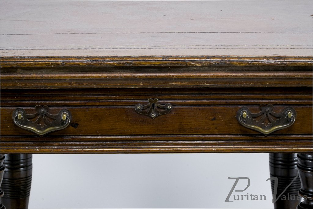 A fine quality Gothic Revival oak leather top writing or centre table with two side drawers, both retaining the original brass handles and escutcheons. The top is supported on four turned legs united to a cross form base with arched feet, the centre crowned with a large turned finial, and four smaller turned finials below the rectangular supports, on original decorative brass castors.