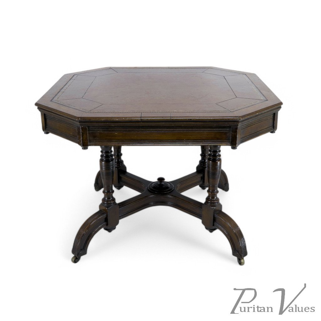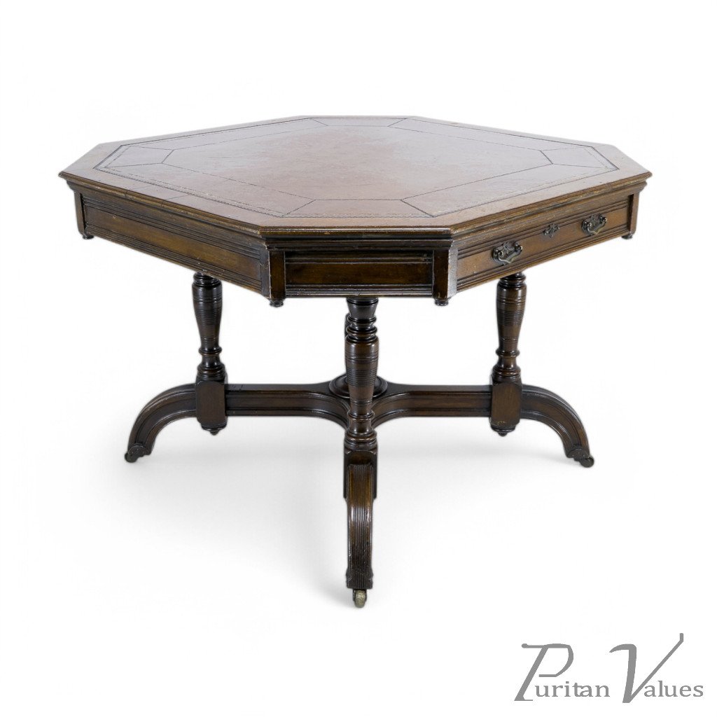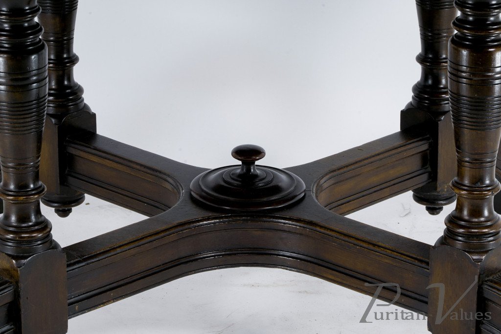 A fine quality Gothic Revival oak leather top writing or centre table with two side drawers, both retaining the original brass handles and escutcheons. The top is supported on four turned legs united to a cross form base with arched feet, the centre crowned with a large turned finial, and four smaller turned finials below the rectangular supports, on original decorative brass castors.