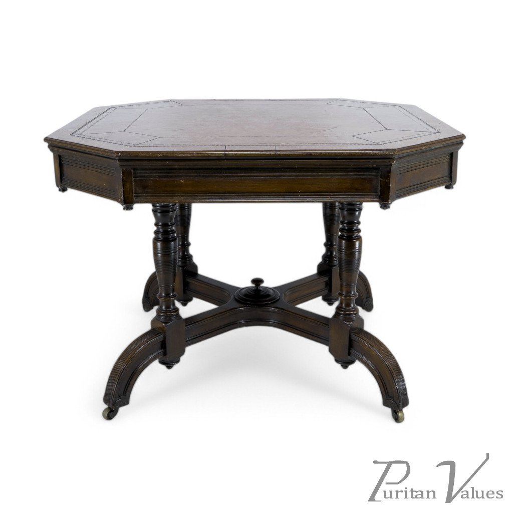 Maple & Co., A Gothic Revival Oak Leather Top Writing Table on Decorative Castors