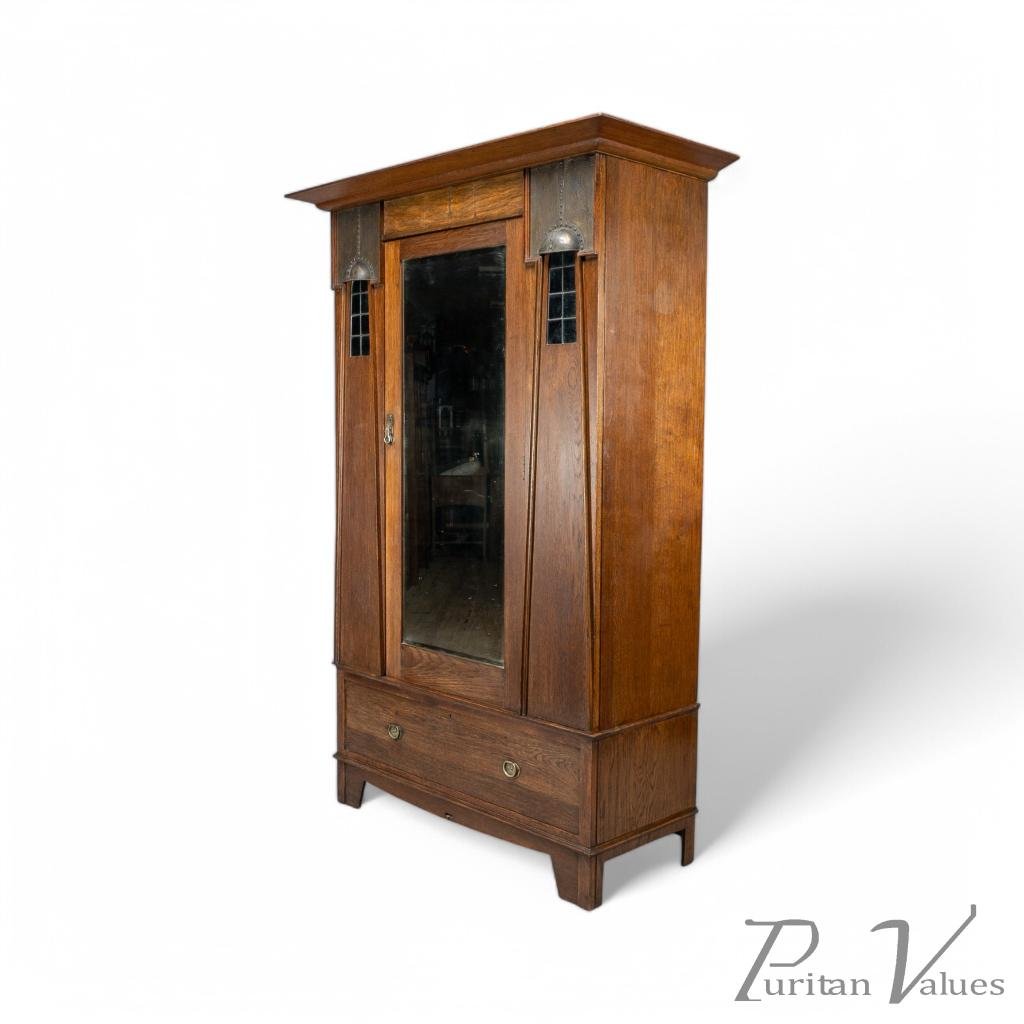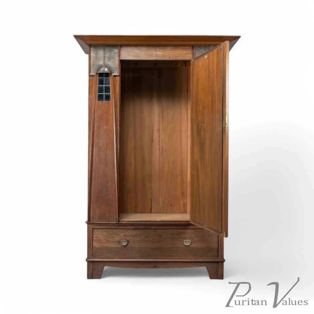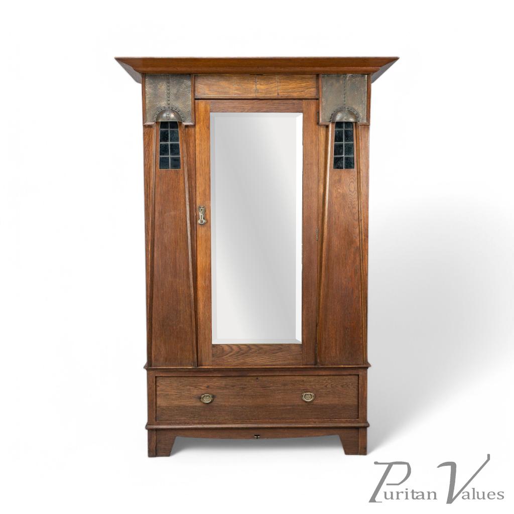 An English Arts and Crafts oak wardrobe with flaring cornice, stylized decorative copperwork hoods above 'A' framed red leaded glass lights with a full-length original beveled mirror door, opening to reveal full-length hanging space inside with a large deep solid oak drawer below, with heart-shaped riveted handles.