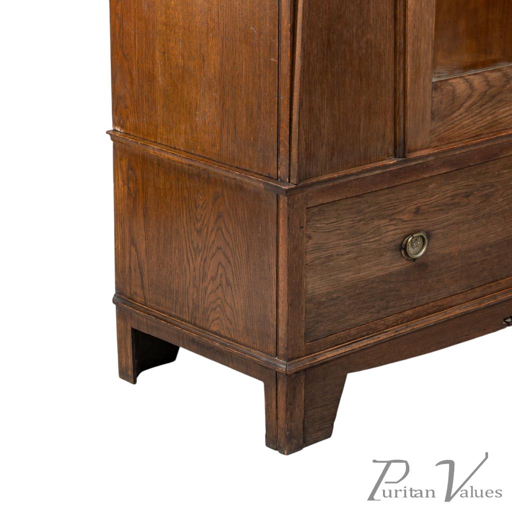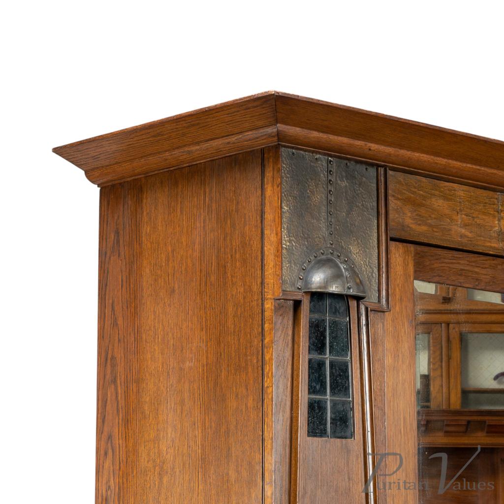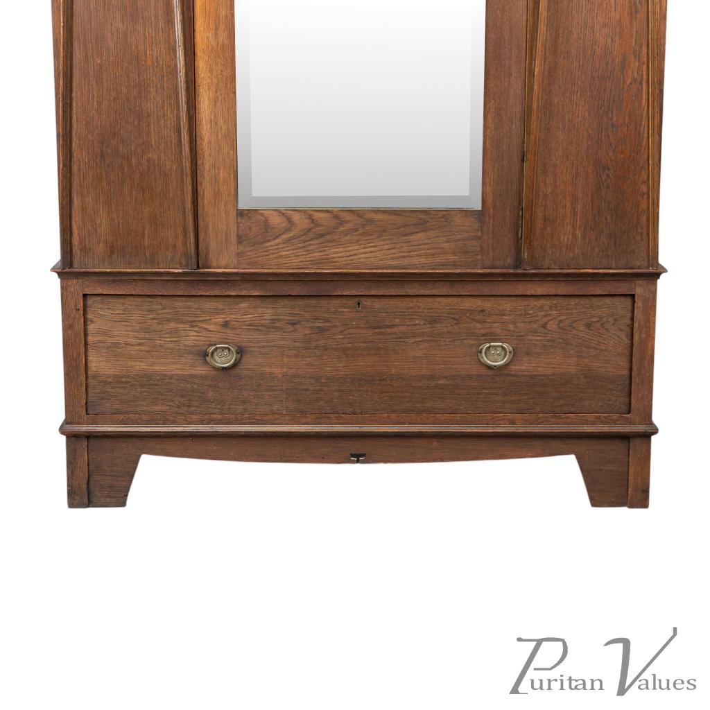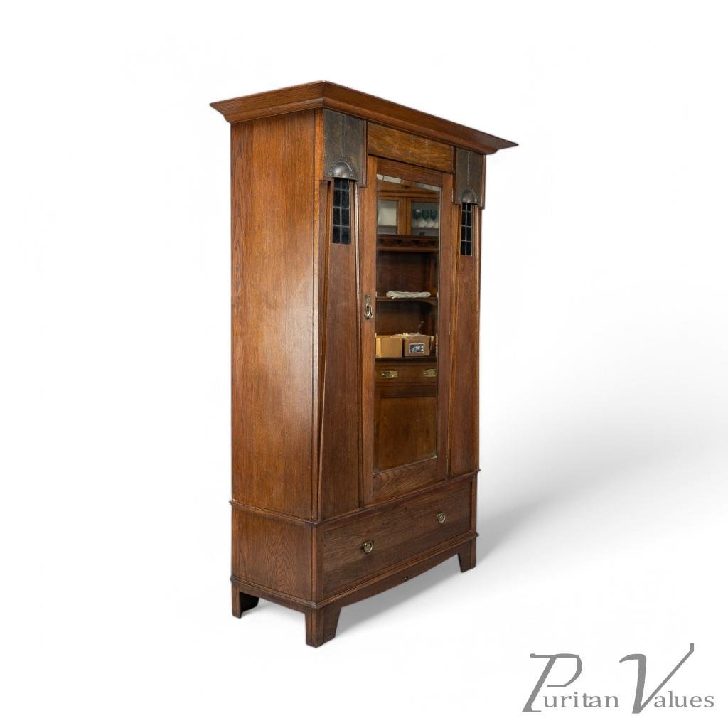 An English Arts and Crafts oak wardrobe with flaring cornice, stylized decorative copperwork hoods above 'A' framed red leaded glass lights with a full-length original beveled mirror door, opening to reveal full-length hanging space inside with a large deep solid oak drawer below, with heart-shaped riveted handles.