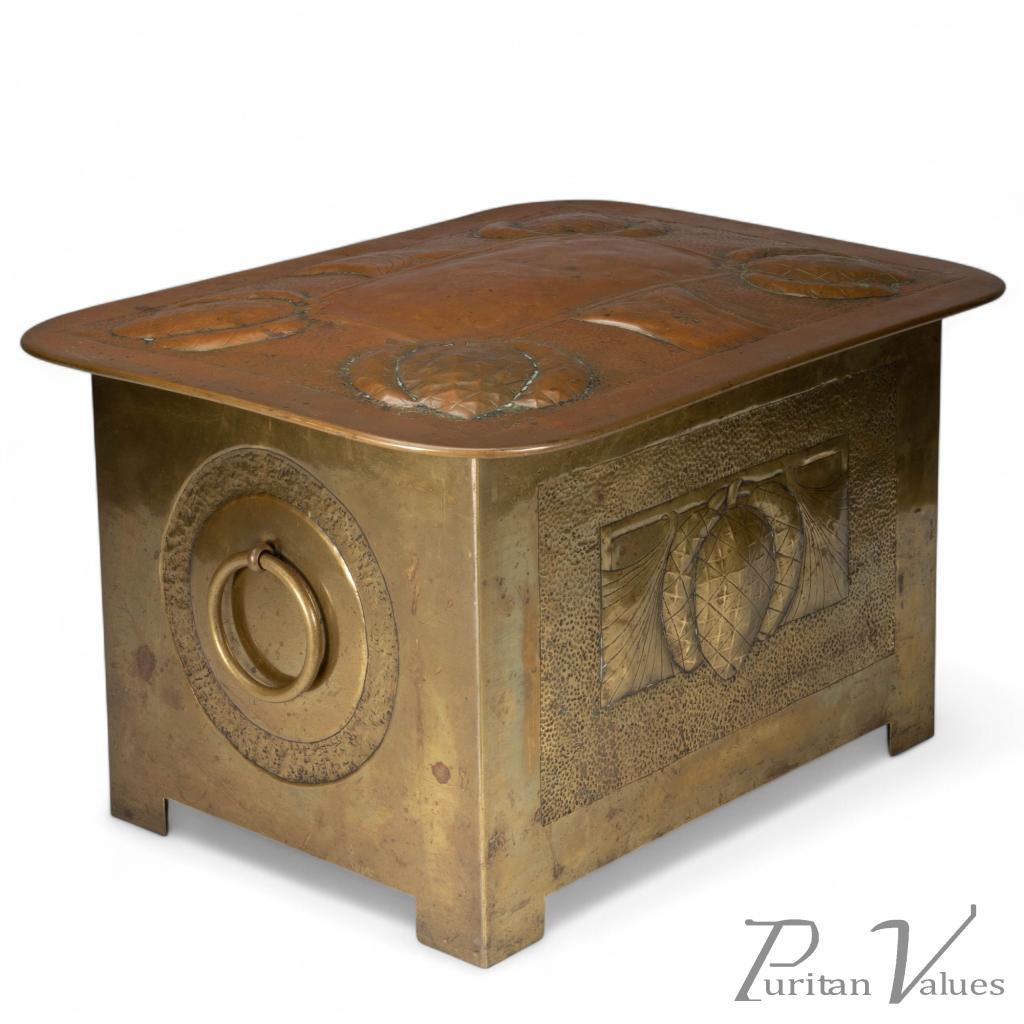 Margaret Gilmour, attributed. Scottish Arts & Crafts Brass Coal Box with Thistle Detail