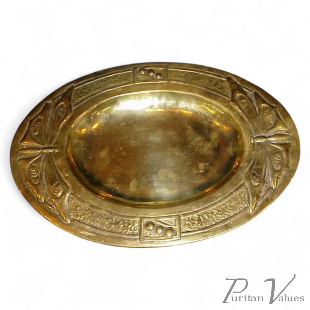 An oval Glasgow School brass tray with butterfly details to the ends (attributed) to M. Gilmour. Width 9". Circa 1900.