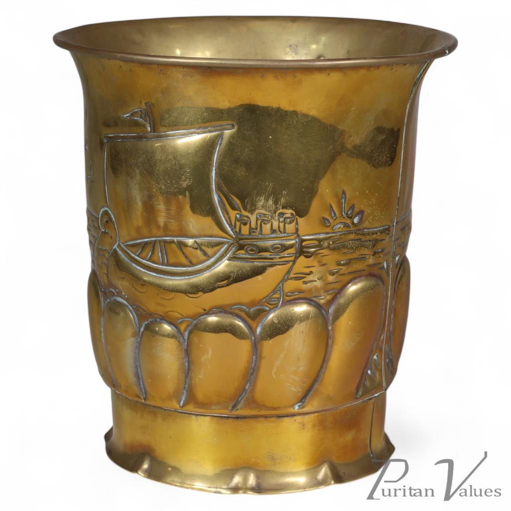 Brass planter in the Margaret Gilmour school, aligned to the Arts & Crafts movement (1880–1910), late phase c.1900–1910 in character. The body shows a crisp pressed and chased scene of a galleon at sea with a rising sun; below runs a repeating band of stylised pods above a separate base ring. A softly flared, rolled rim completes the silhouette, motifs and handling consistent with Scottish Arts & Crafts metalwork associated with Gilmour’s Glasgow circle. Practical as a cache-pot; use a glass or plastic liner to protect surfaces.