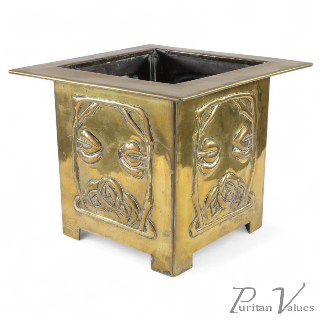 An Arts and Crafts Glasgow School brass planter with stylized rose and floral details to all sides stood on typical Gilmour studios triangular feet.