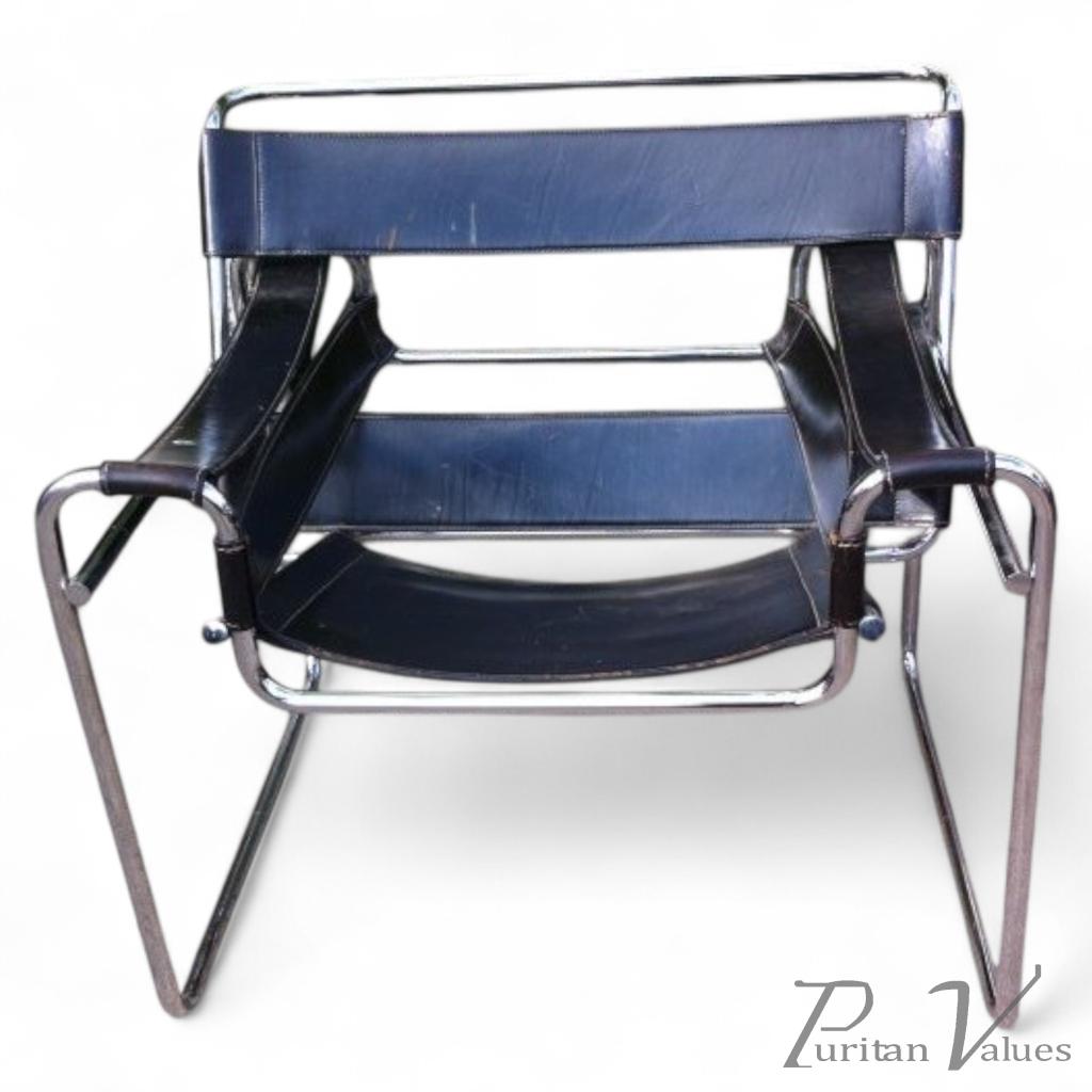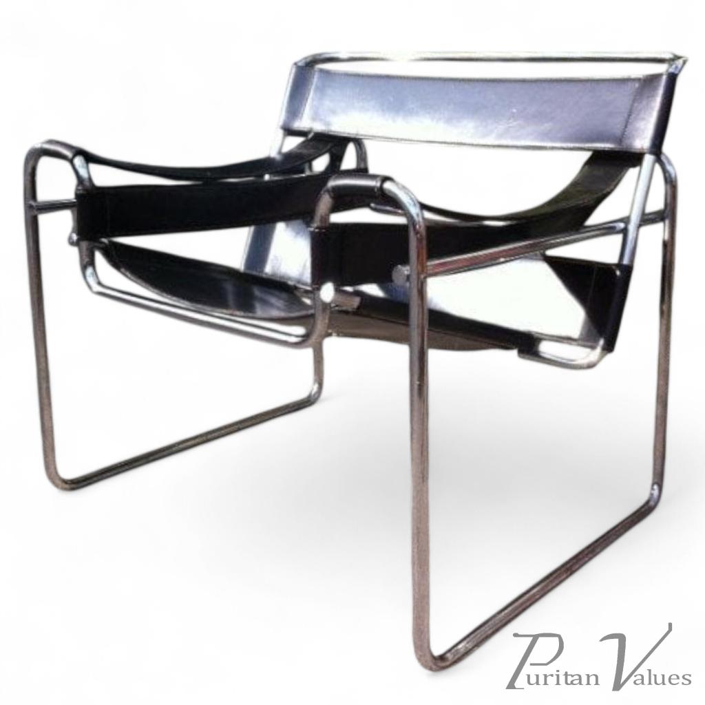 This modern Wassily chair is a later reproduction of the original Bauhaus design by Marcel Breuer from 1925. The form is defined by a bent tubular steel frame with leather seat, back, and arm straps, expressing the Modernist principle of function refined through industrial materials.