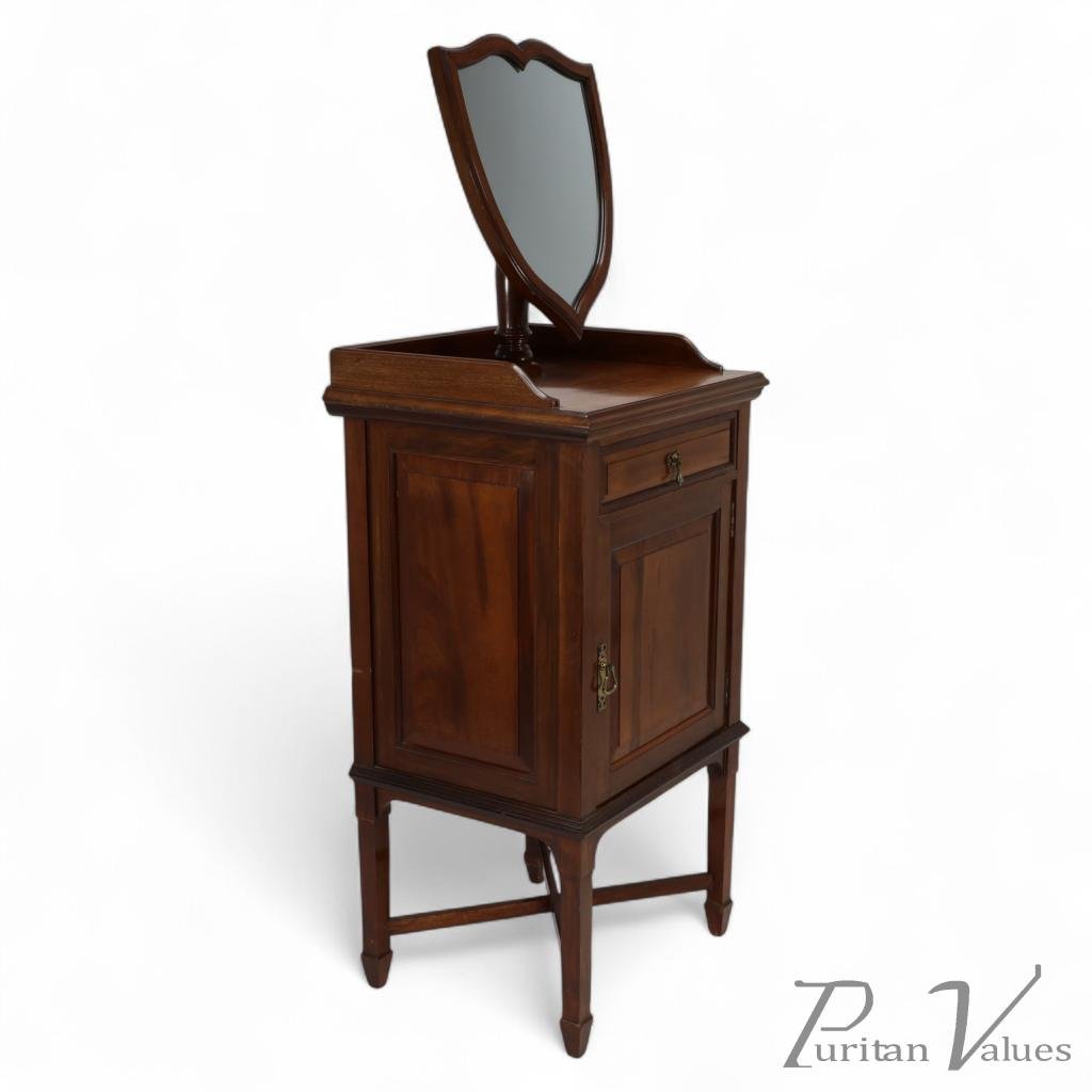 A fine quality Arts & Crafts Walnut wash or shaving stand, with adjustable extending shield shaped mirror, upper drawer and cupboard lined with Sienna marble. The square tapering legs with arrow head feet are united by a cross stretcher.