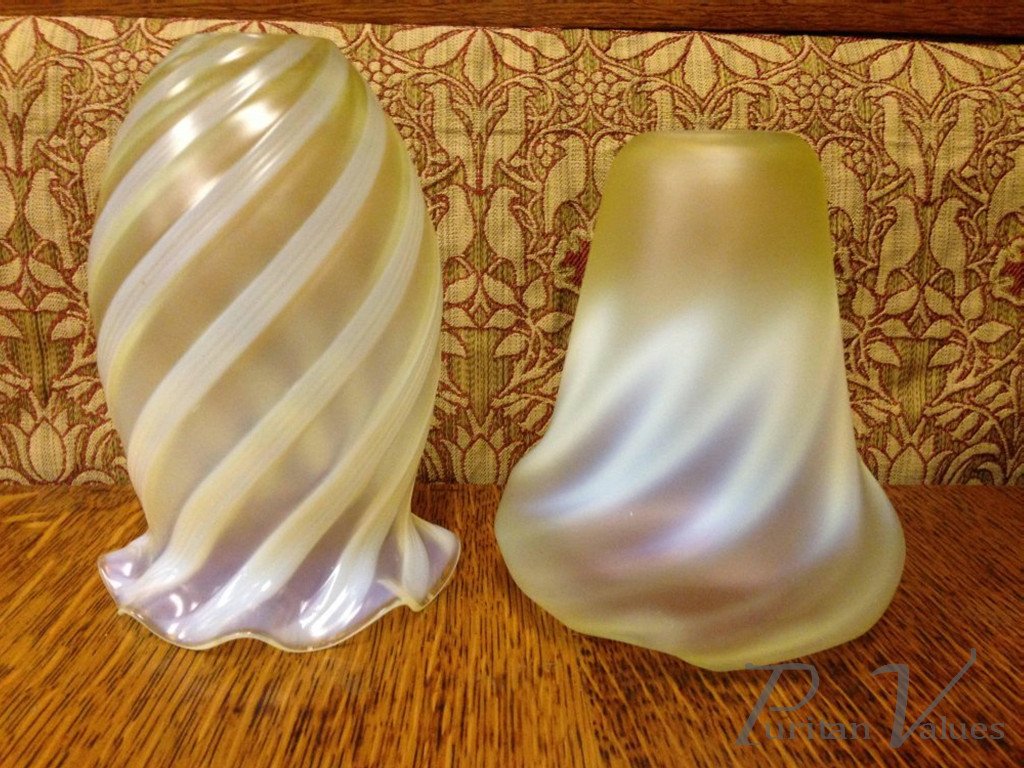 One Arts & Crafts Vaseline/ Uranium Glass Shades, One Swirl, One Zigzag Patterned