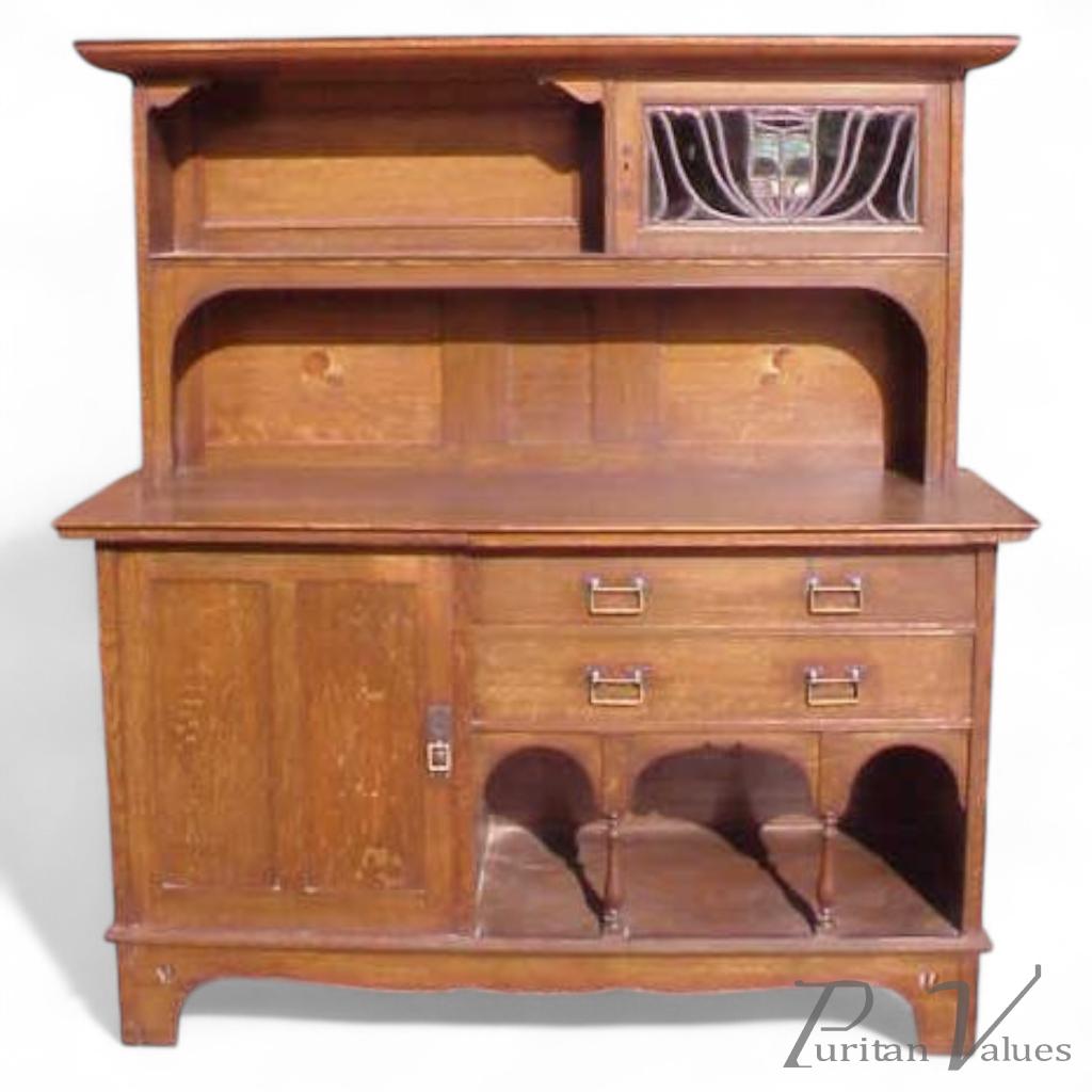 An oak Arts and Crafts sideboard in the manner of E A Taylor and made by P.E.Gane. It has a very unusual slide that gives you extra serving area which pulls out from just below the centre of the main work area. It also has stunning stained glass panel to upper right hand cupboard, inlaid with Tulip wood, Stained Sycamore and walnut to each side, above the work area and hand made handles. Height 6', Width 66" Depth 25 1/2". circa 1900.