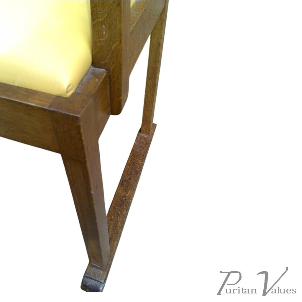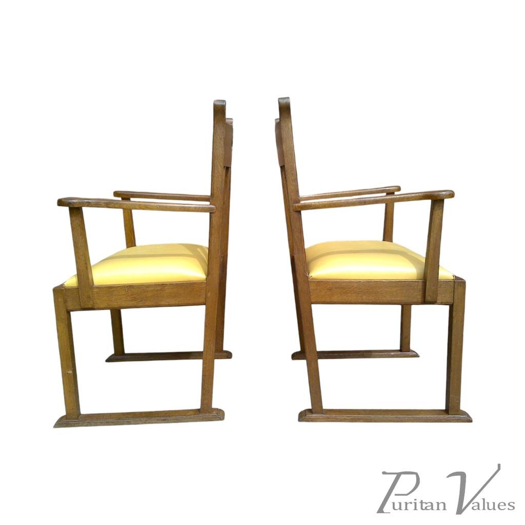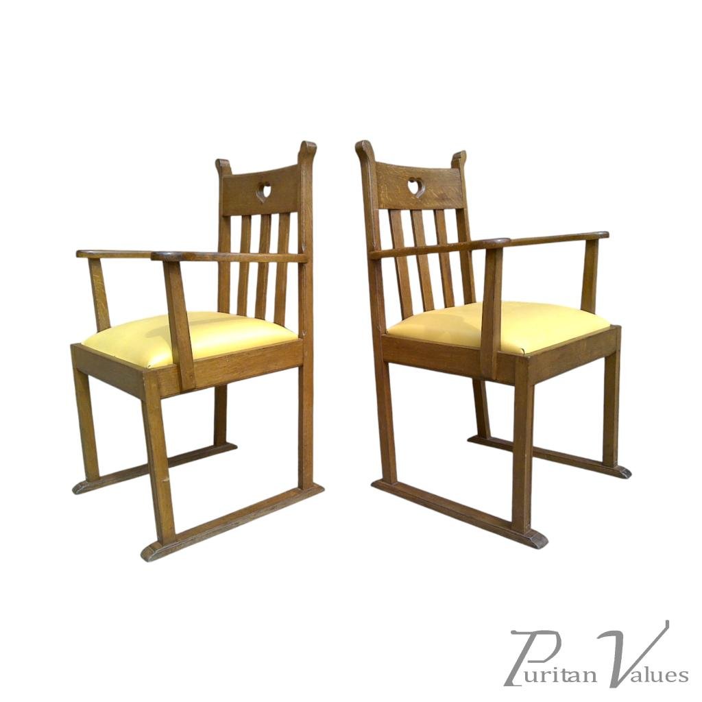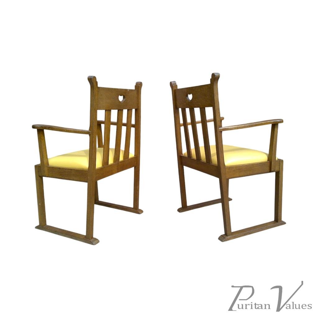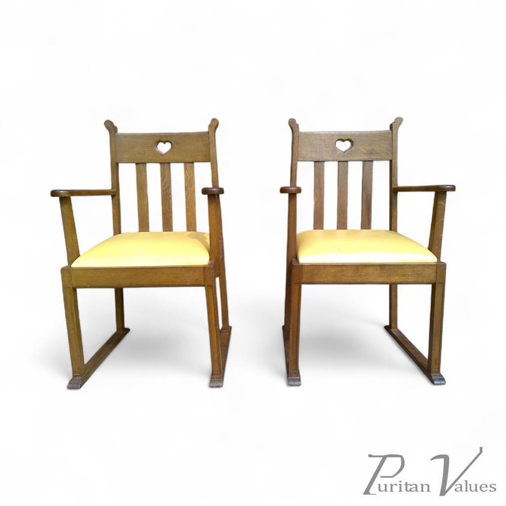 The pair of armchairs in oak of Arts and Crafts (1880–1910) design, c.1910, British. Each chair has a rectangular back with a small heart cut-out to the crest rail, open arms on square uprights, and an upholstered seat over straight legs that run into sled-style feet.