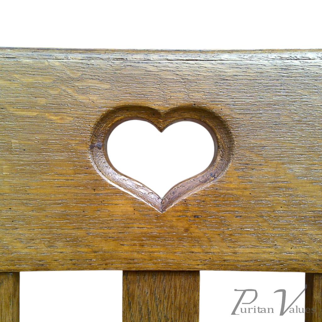 Construction is expressed through simple rectilinear members and slatted backs, with gently shaped arm terminals and crisp shoulders. The decorative vocabulary is restrained, relying on the pierced heart motif and proportion.