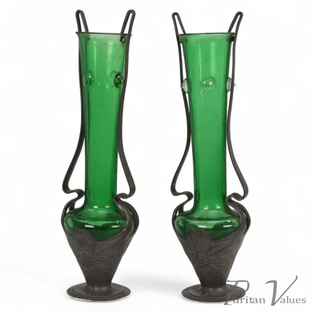 Osiris Pewter. a Pair of Art Nouveau Pewter and Green Glass Twin- Handled Vases