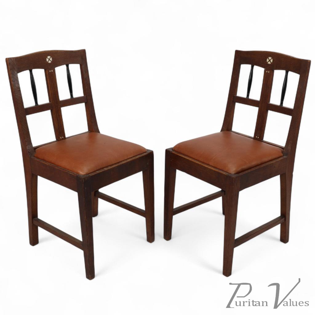 Pair of oak side chairs from the Vienna Secession period (1900–1910), c.1900. Each chair features a rectilinear back with three vertical ebonised spindles, curving gently towards the top rail. The pierced diamond inlay to each back adds a restrained decorative touch, typical of the Viennese interpretation of geometric modernism. The solid oak frames are of fine quality and have been reupholstered in hand-dyed brown leather, carefully finished to a high standard.