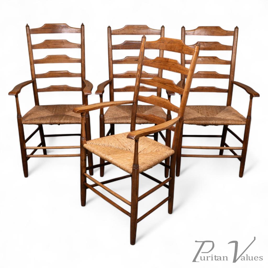 A fine set of four early Arts and Crafts ash ladder back armchairs with pegged joints. Slightly larger than usual, beautifully made with sculptured ladders and all in wonderful original condition.