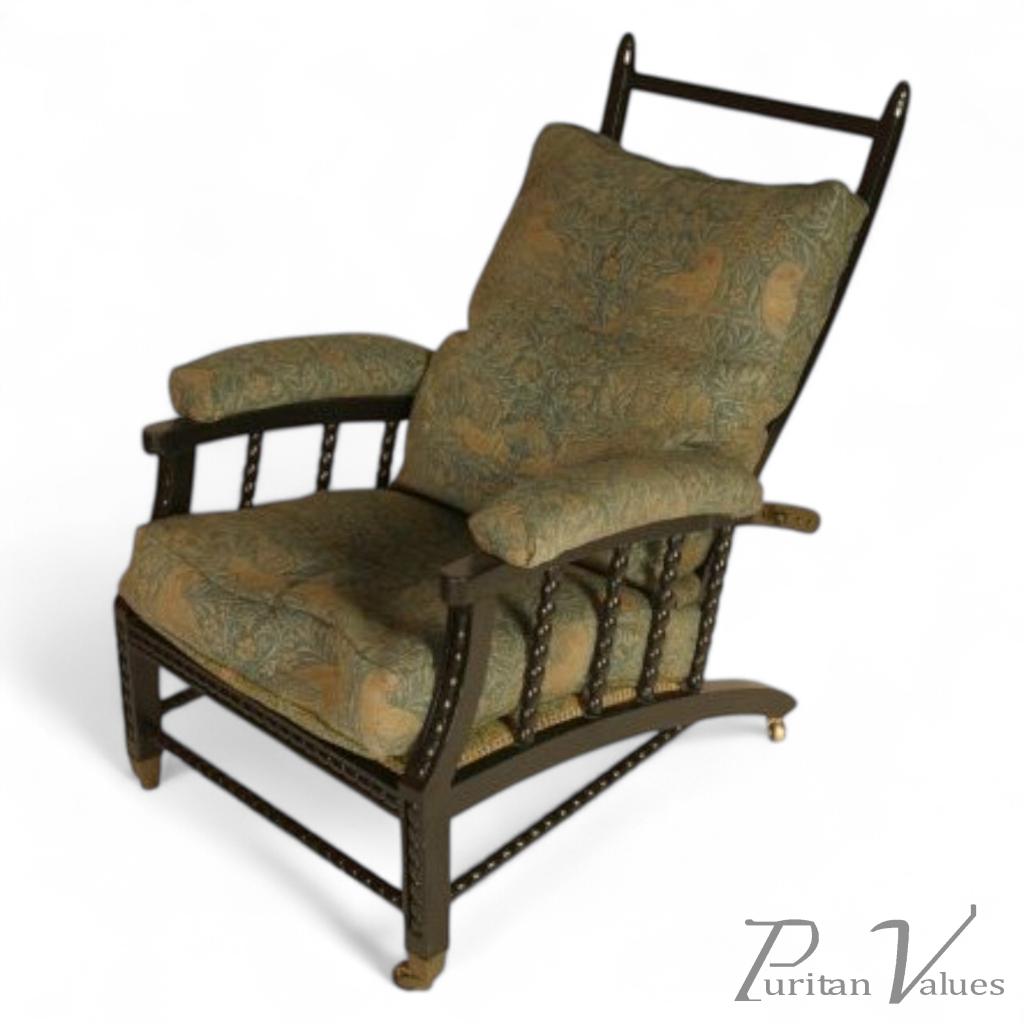 Two Morris and Co adjustable ebonised armchair's designed in 1866 with arched arms and legs united by refined bobbin turnings with adjustable back and bobbin turned stretchers on brass and ceramic castors re-upholstered in original Morris and Co double woven Bird fabric. These elegant timeless recliners were based on a design from an earlier traditional prototype found by George Warrington Taylor (Morris and Co's business manager) in the workshop of an old carpenter named Ephraim Colman in Hurstmonceaux, Sussex, in 1866. He drew a sketch and wrote description of the chair and sent it to Philip Webb and these two examples are the exact models that were adapted by Phillip Webb for production by Morris and Co. So rare to find 1. A dream to find 2. An icon of the 20th Century. Designed by Phillip Webb. After Circa 1866.