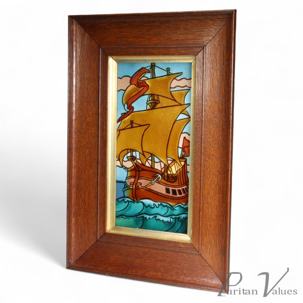 This tile in ceramic sits within the Arts & Crafts (1880–1910) tradition, c.1900, English, made by Pilkington’s Tile Works. The panel shows a galleon in full sail on a turquoise sea, the drawing strong and graphic with dark outlining and warm ochre sails. The image is presented within a plain timber frame that keeps the focus on the maritime scene and protects the tile for hanging display.