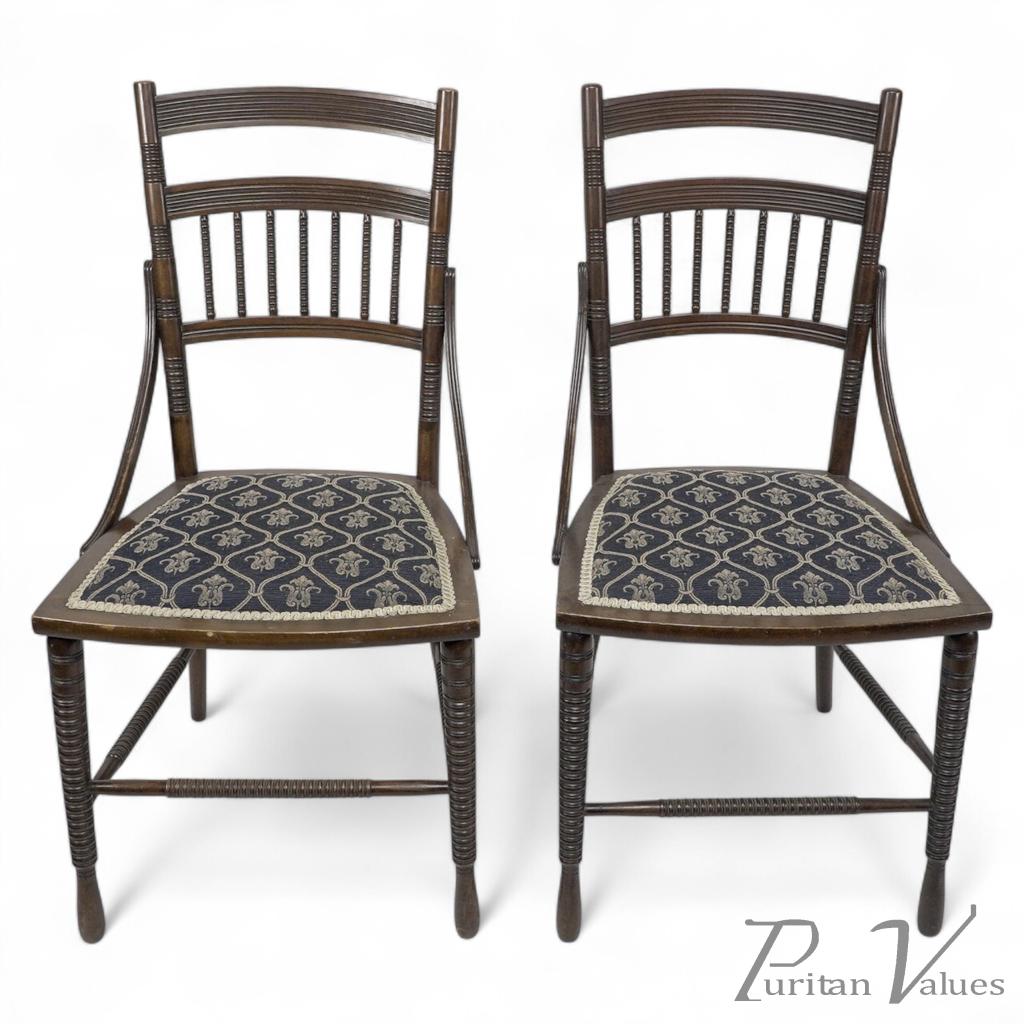 A fine pair of Aesthetic Movement walnut side chairs with fine ring turned and incised tramline details, and sweeping side supports.
