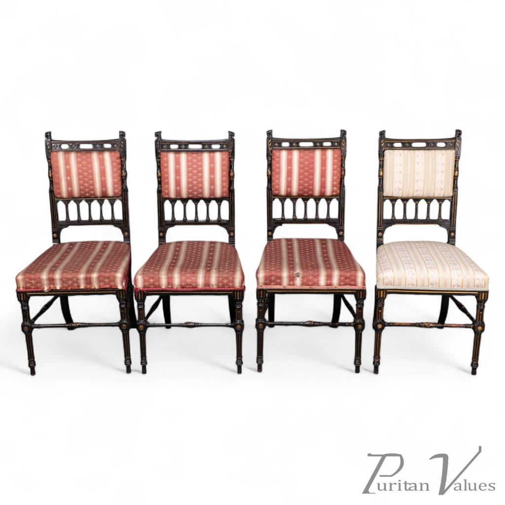 The last image shows the six chairs I have available for sale. The pair is available here: Https://www.puritanvalues.com/product/whytock-reid-a-pair-of-aesthetic-movement-ebonized-parcel-gilt-side-chairs.