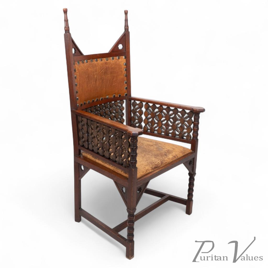 This oak armchair, made by Liberty & Co. during the Arts and Crafts movement c.1890, exemplifies the firm’s fascination with Moorish and Eastern design motifs that informed much of their late nineteenth-century furniture. The structure is rectilinear, softened by carved geometric lattice panels and decorative finials rising from the back uprights.
