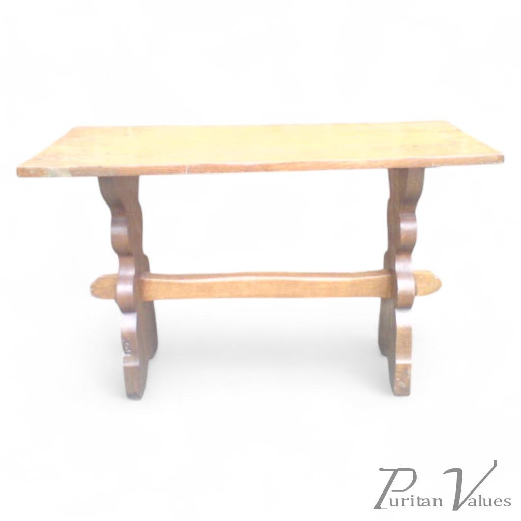 An Arts and Crafts oak table by Robert 'Gnomeman' Whittiker. Height 29 1/2", Width 45 1/4", Depth 19 1/2".