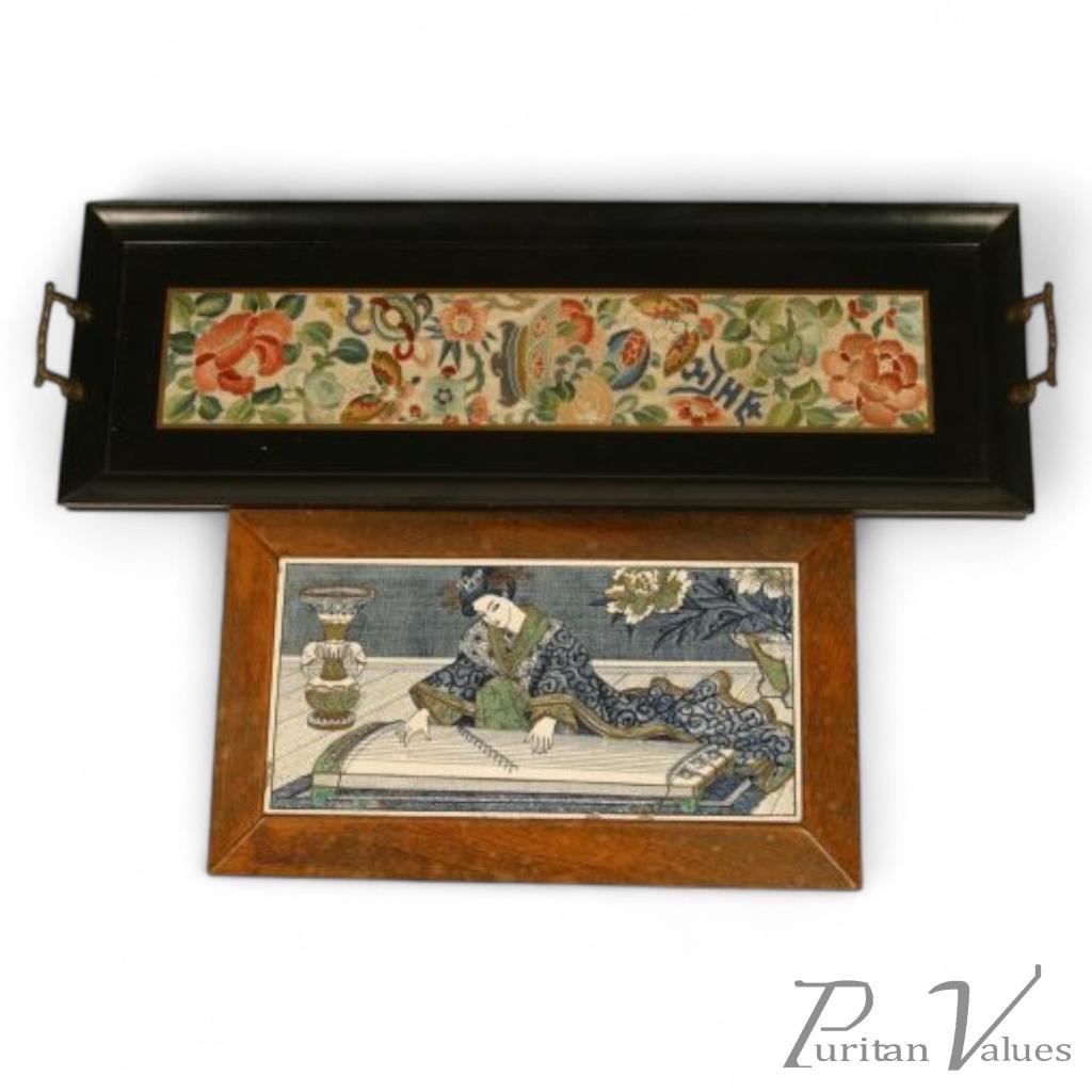 A tile depicting a Japanese woman playing a stringed instrumentProbably by Royal Worcester. Circa 1875. Tile Length 12", Tile Width 6". TILES SOLD.