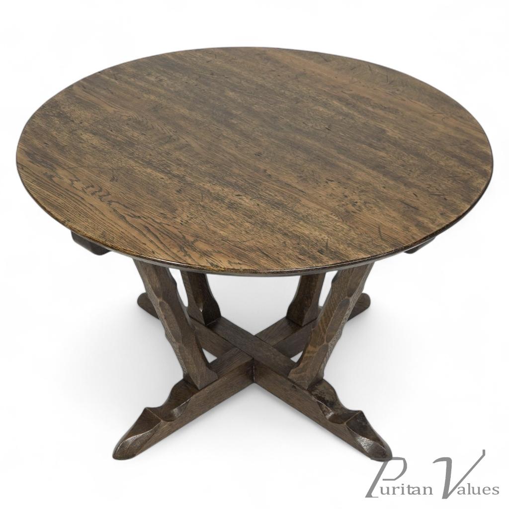 A late Arts and Crafts oak circular coffee table with deep sculptured chamfered details raised on angular legs that united to a cross stretcher footed base. Made by Rupert Griffiths of the Monastic Woodcraft Furniture Company.